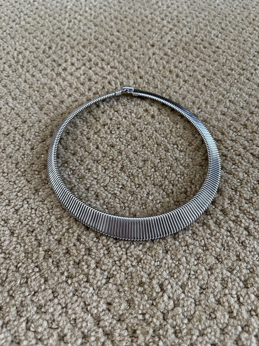 VenmoThis is in excellent condition. Vintage jewelery is a higher quality than jewelry made today. This gradually gets a little wider as it gets closer to the front of the necklace. It has a strong clasp to hold it on. It measures 17 1/2 inches long. This has no markings on it. Price is firm.