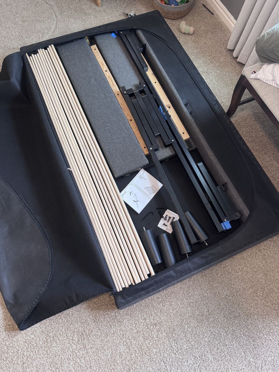 Located in Cottonwood Heights. The bed is disassembled and packed into the headboard, makes for super easy transport. Assembly is very simple, instructions and tools are included.