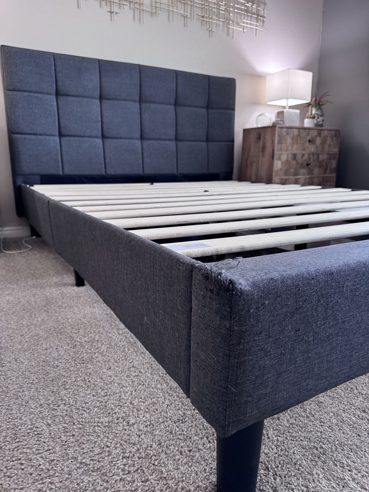 ApplePayMid-century modern queen bedframe, upholstered in dark gray fabric.