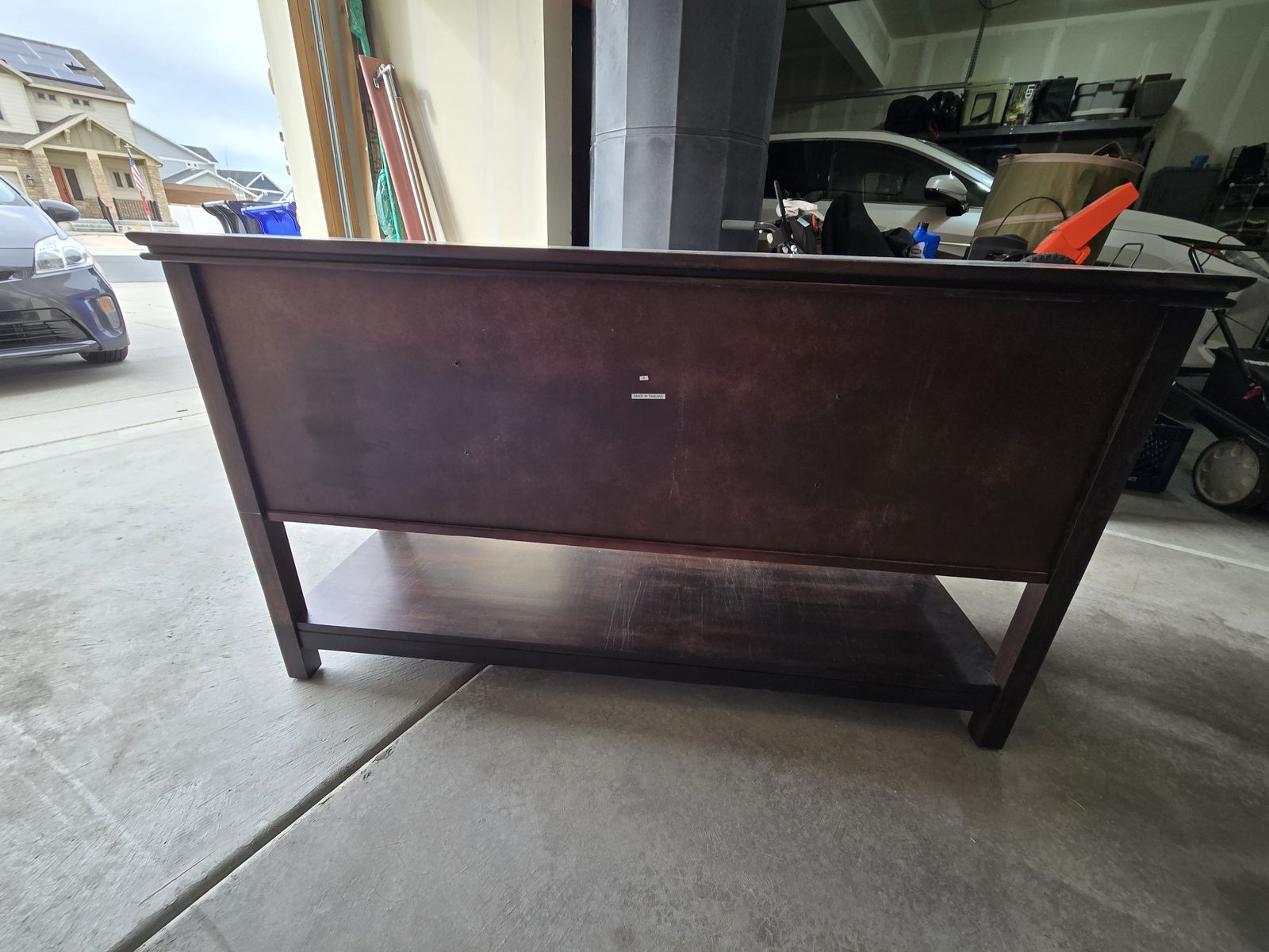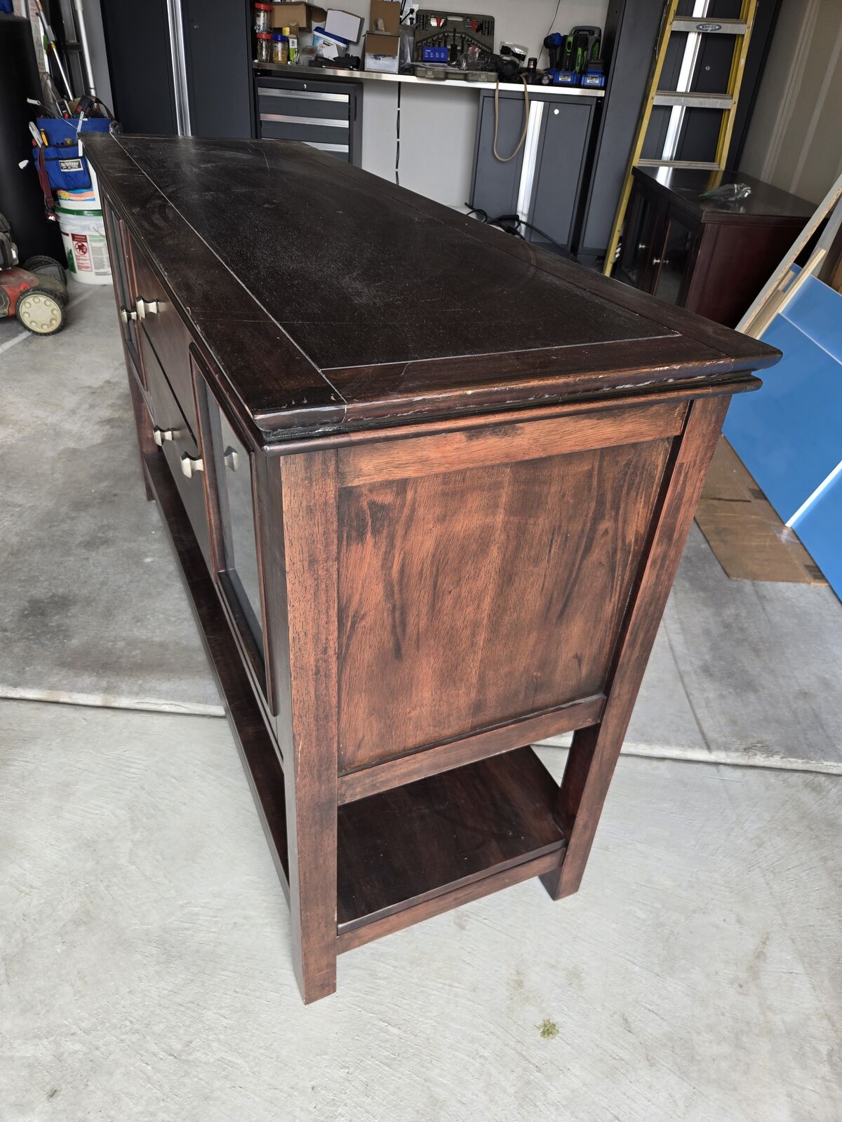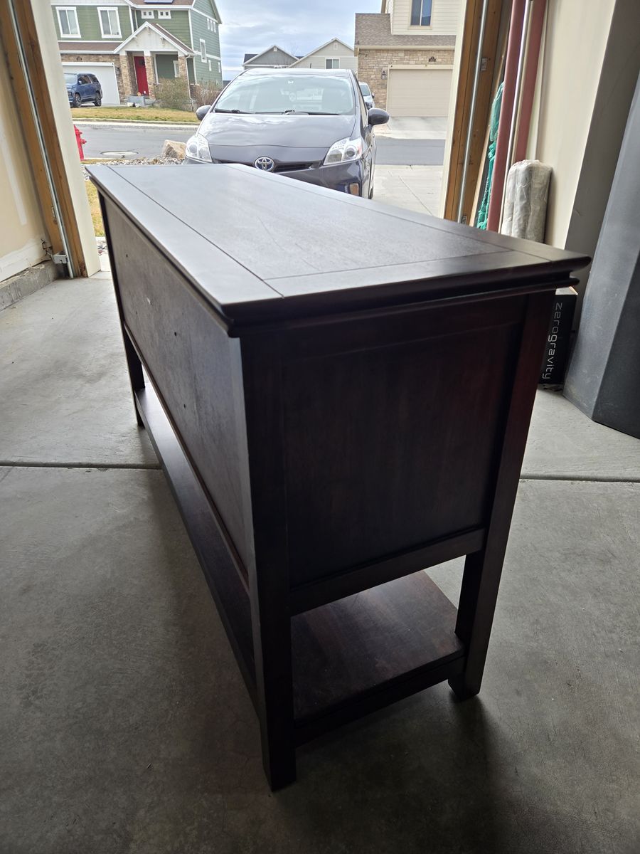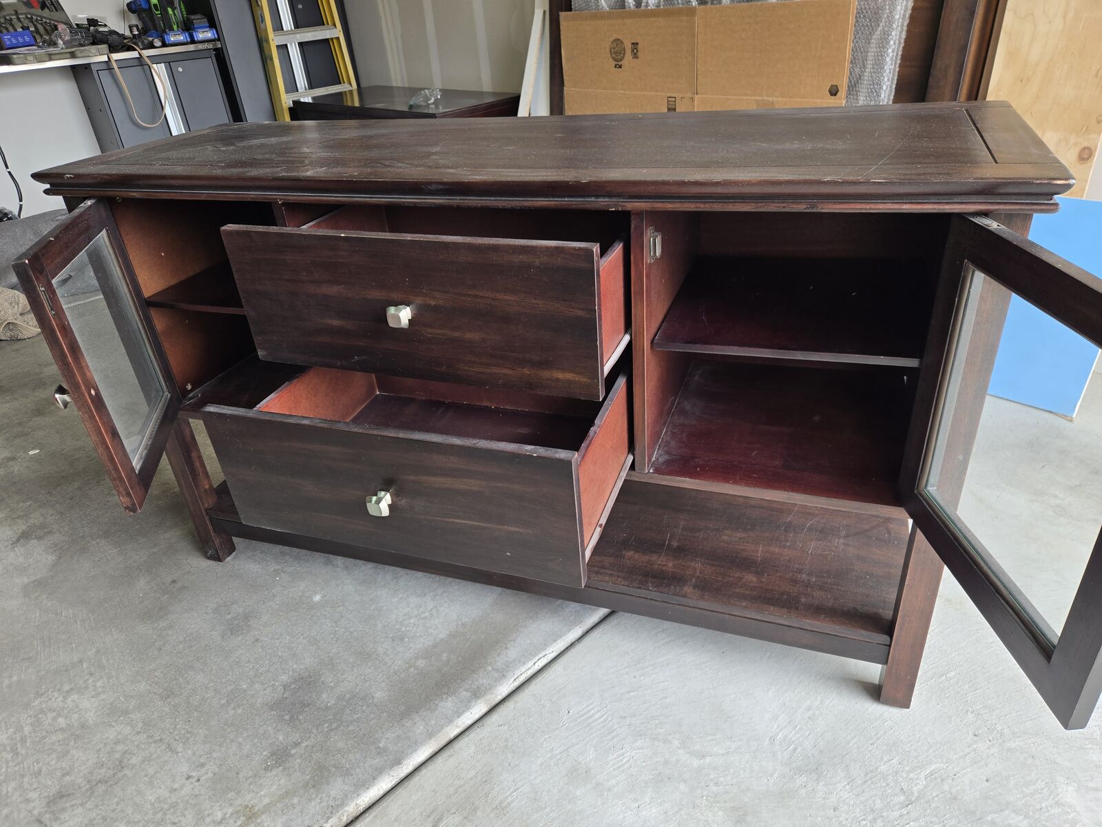 VenmoSolid Wood Media Console. 59"Lx19"Dx34"H. Glass door on each end with adjustable shelf. 2 drawers in middle. Great set up for TV, BlueRay player, game consoles, and or stereo equipment. Good used condition. $175 or best offer.