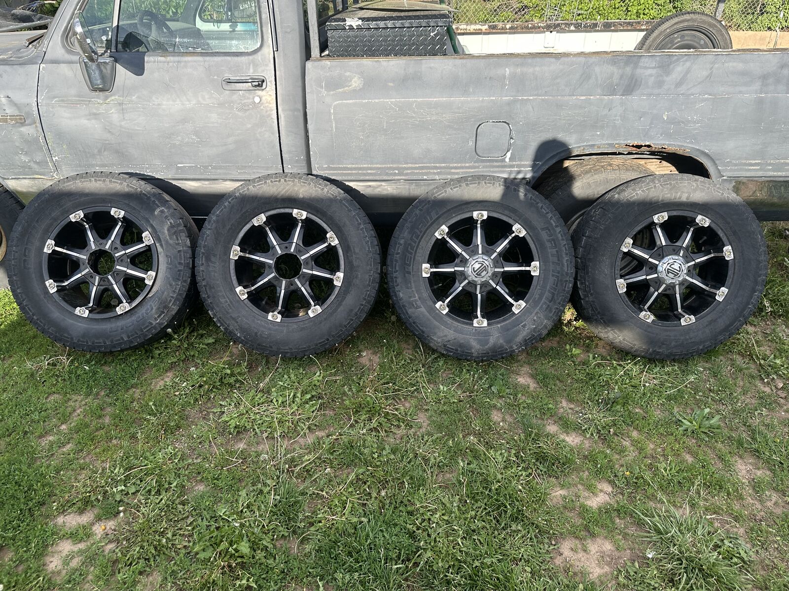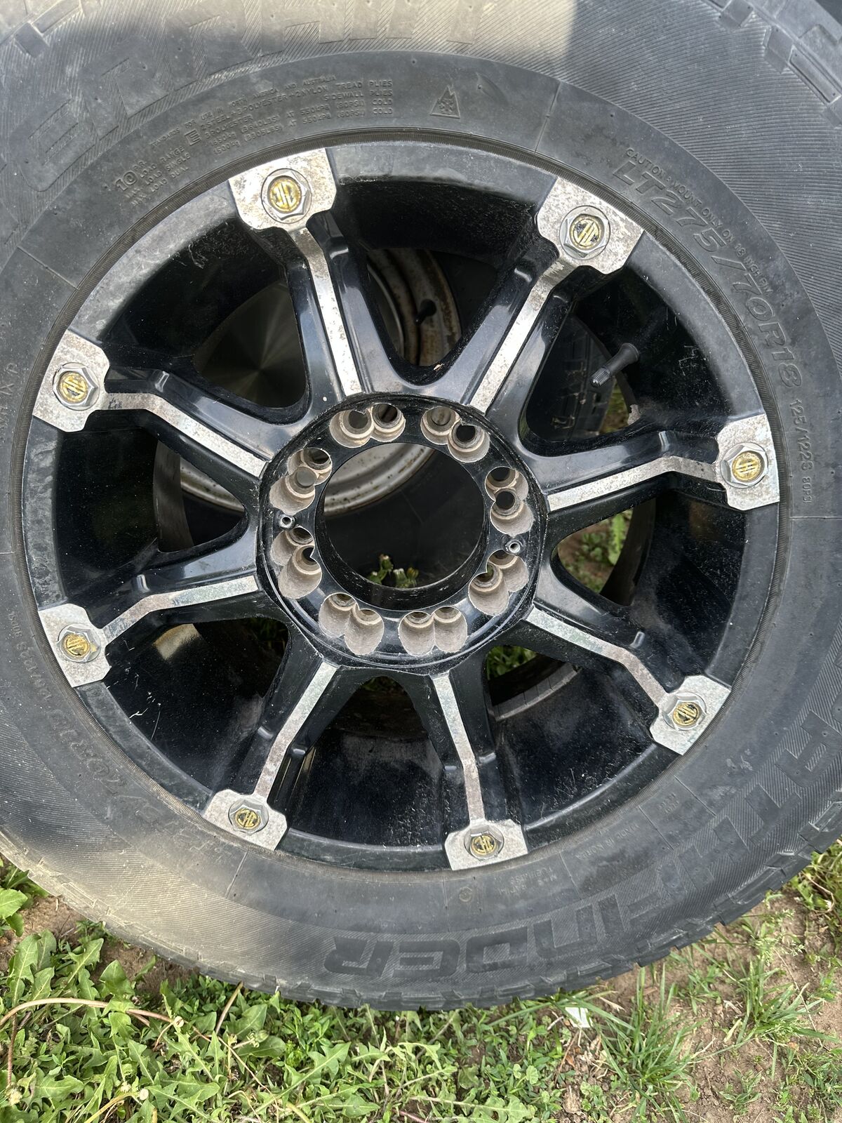 Venmowheels and tires size 18 x 9. 8x6.5 and 8x170 for the bolt pattern. Xtreme NX-3 (off of what I could find) they have Lt275/70 r18 pathfinders on them. They all have the main part of the center caps but are missing two of the chrome pieces. One is at 4/32 one is at 5/32 one is at 6/32 and the last one is at 7/32.