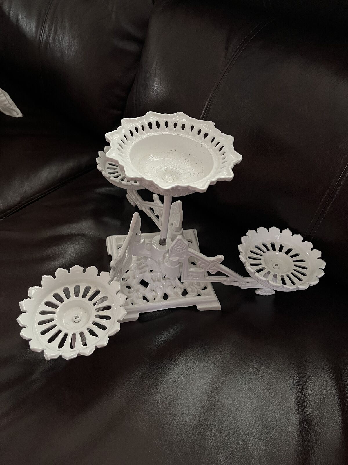 VenmoThis is an quite unusual plant stand. It is heavy and made of cast iron. It appears to have been painted with a powder coating, that is a beautiful glossy white paint. The arms move and are removable. With the arms all spread it measures 15 inches. The height is 10 1/4 inches tall. The base is square and is 5 3/4 inches. The top holder is larger than the other three. It measures 5 1/2 inches wide. Inside the pot it measures 3 1/4 inches wide x 1 3/4 inches deep. The other three are all the same. They measure 4 1/4 inches wide, the inside pot measures 3 1/4 inches x 5/8 inch deep. Perfect to sit on a table top. This is marked Japan on the bottom. A very fun and pretty piece. Selling for a parent. Price is firm.