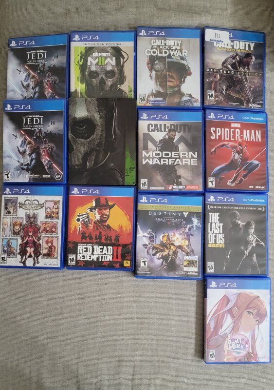 Doki Doki Literature club - $15 The last of us Remastered - $15 Call of Duty advanced warfare - $10 Destiny the taken king legendary edition - $10 call of duty modern warfare 2 (with limited edition case) - $20 Kingdom hearts melody of memory - $10 call of duty modern warfare 1 - $10 Marvel spider man - $20 Star wars Jedi Fallen order - $15 Red Dead Redemption 2 - $20 Call of Duty Cold War - $25
