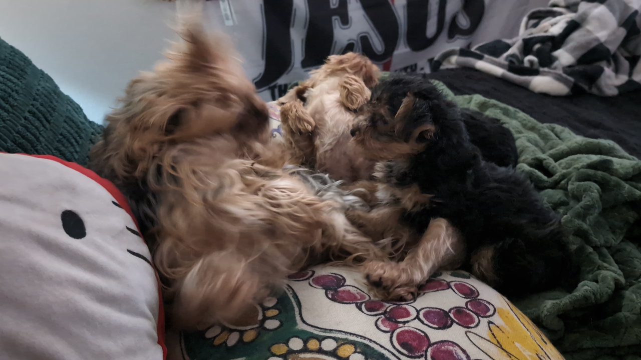 I have 2 female purebred Yorkie Terrier puppies ready to go to a happy home. Puppies were born January 11th. They have docked tails, their dew claws have been removed, and they have been dewormed. Puppies are black and tan now, but are sure to develop the classic Golden Tan and Blue Steele Gray that is most known and popular among the breed. Mom and Dad are on the premises. Both Mom and Dad are sweet, loving, playful, and are of good temperament. Both parents weigh approximately 7 lbs. Puppies are currently being puppy pad trained. Their teeth are starting to come in, and they are able to eat soft dog food and drink water; additionally, they will continue to be nursed by Mom as long as she allows. Each puppy is distinct in personality, and all are sweet, loving and playful like their parents. Puppies will go to their new home with a puppy care package that includes blanket, chew toys, teethers, baby shampoo, puppy pads, food and water bowls, poopy bags and dispenser, puppy food, doggy treats, doggy wipes, and a plushie toy, all packaged in a basket. More photos of puppies and of Mom and Dad will be added to this posting soon.