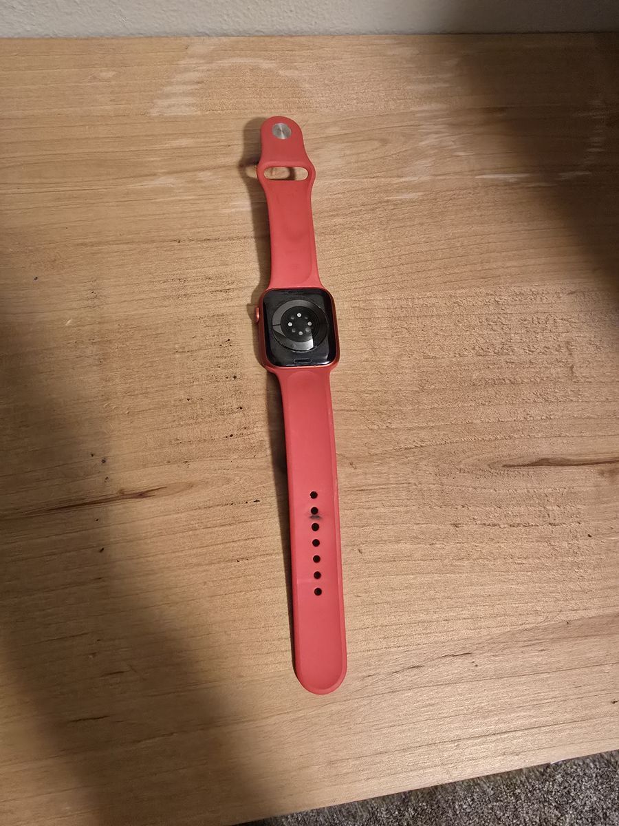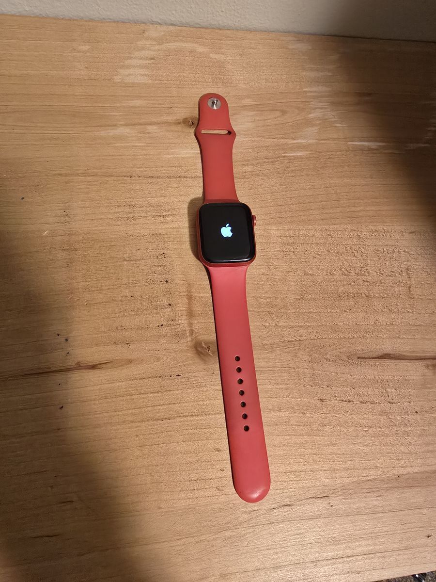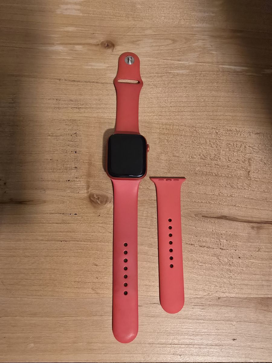 Apple Watch 6th Generation Product Red 44mm GPS model. Comes with original charging cable, wristbands (both sizes), and box, as well as one off-brand wristband.