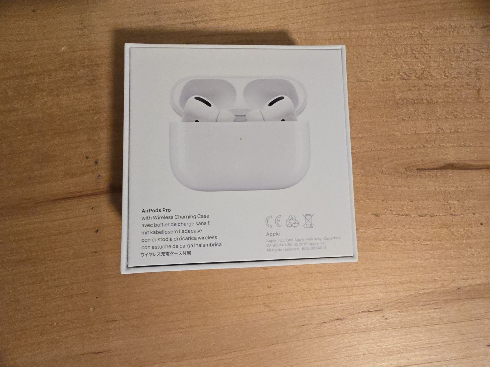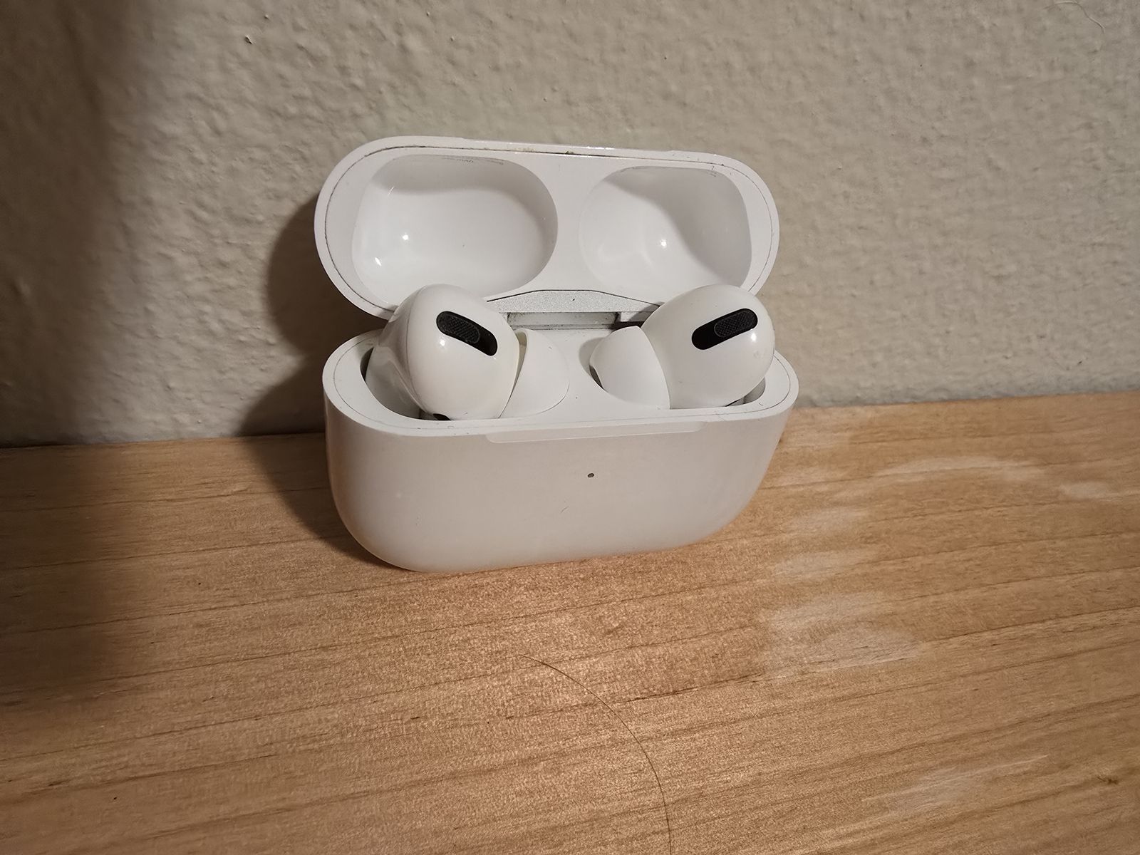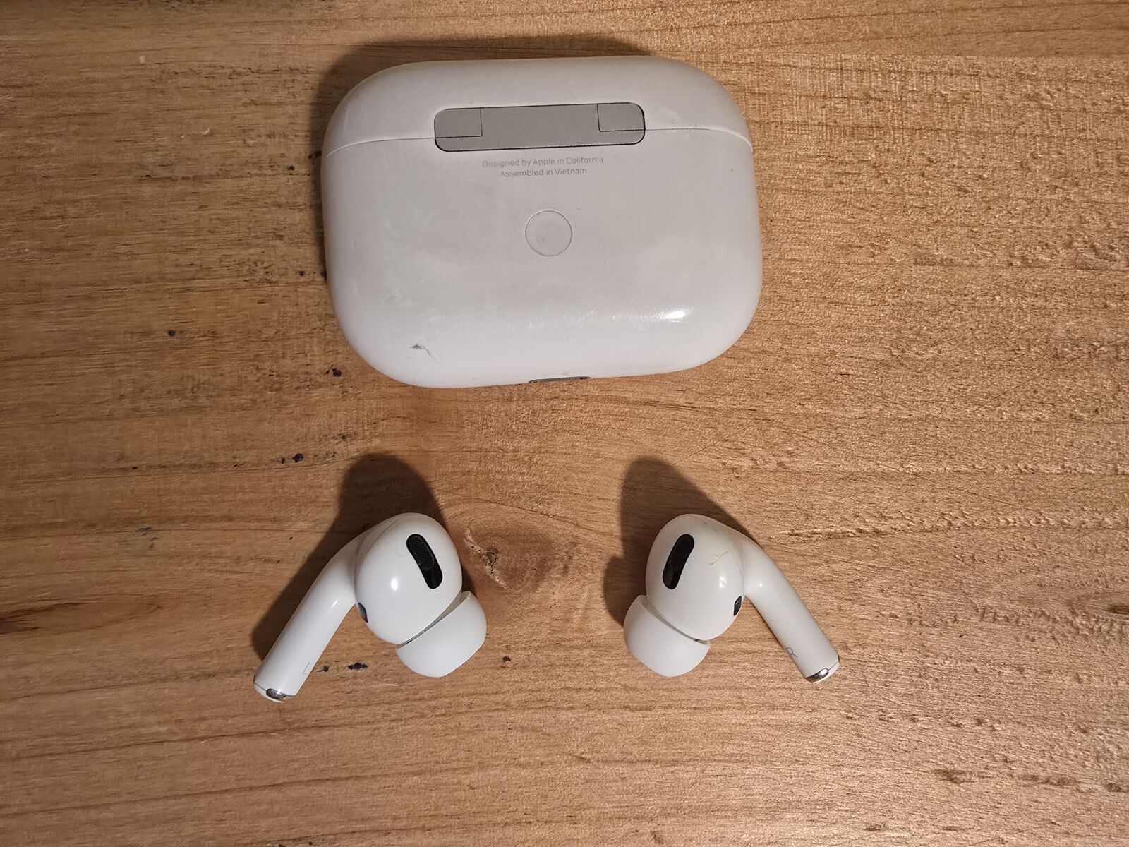 Apple AirPods Pro 1st Generation. Includes charging case, both AirPods, original charging cable, and box. Missing one of the size small rubber ear pieces.