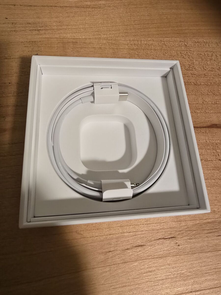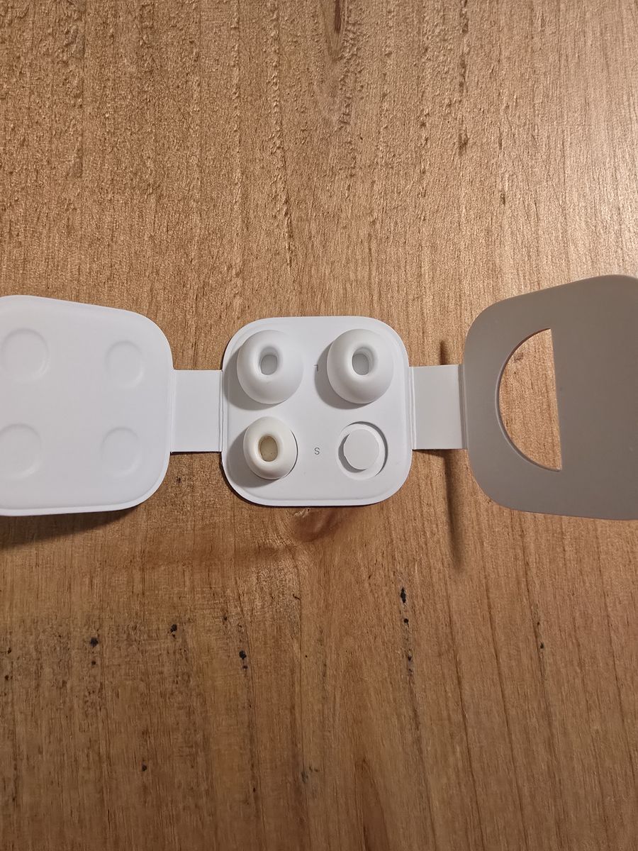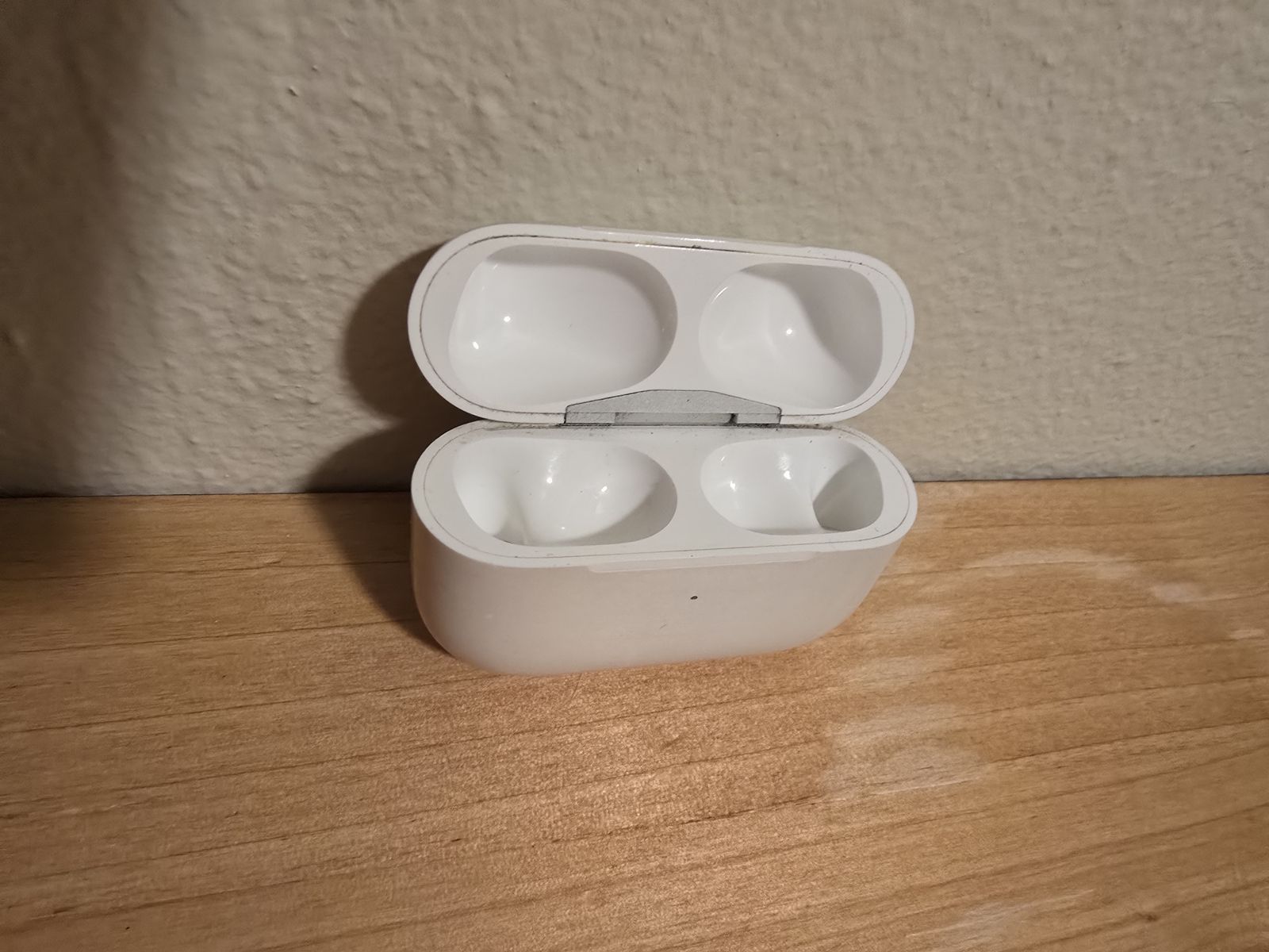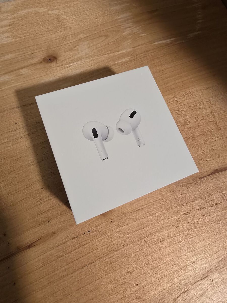 Apple AirPods Pro 1st Generation. Includes charging case, both AirPods, original charging cable, and box. Missing one of the size small rubber ear pieces.