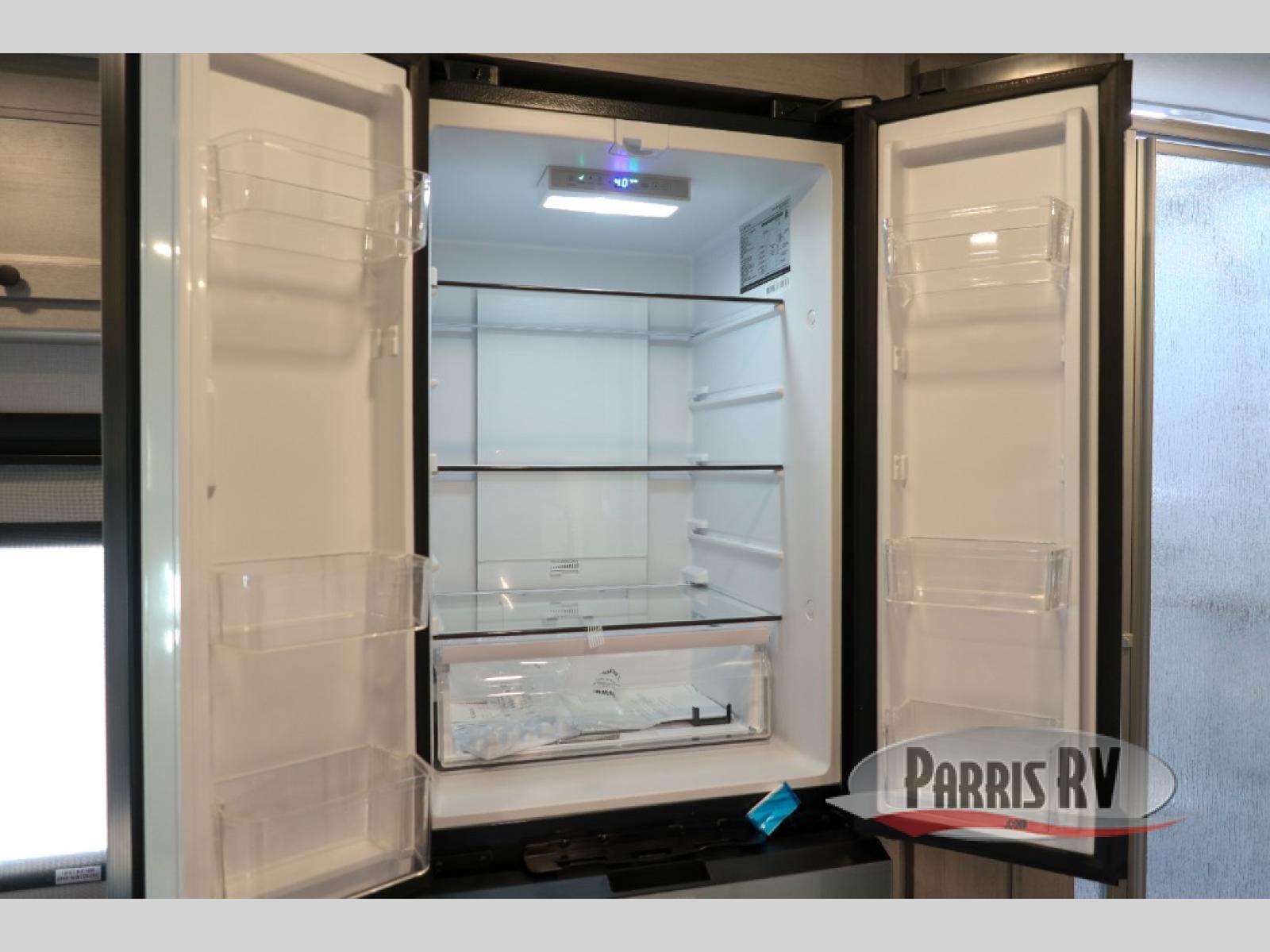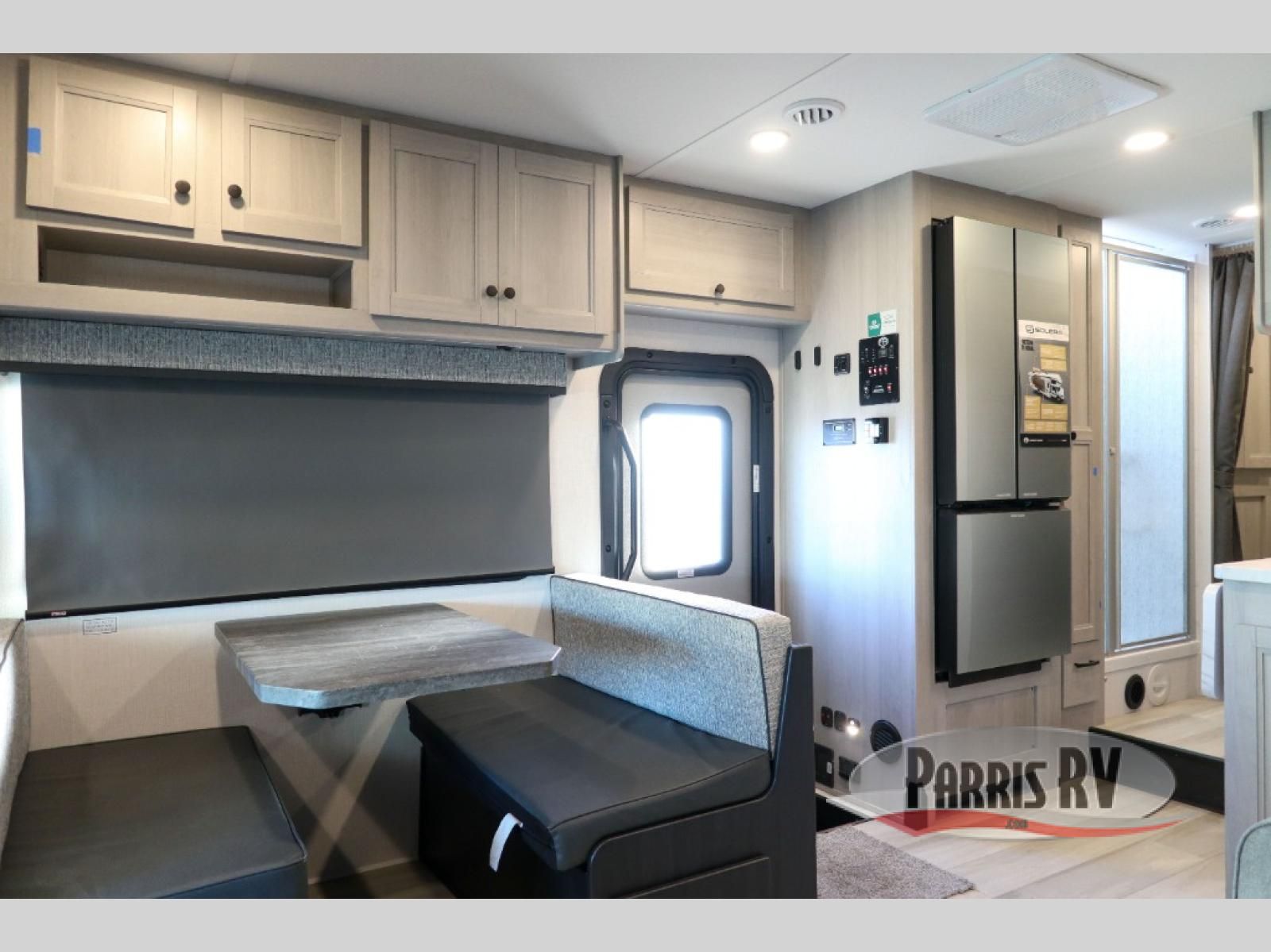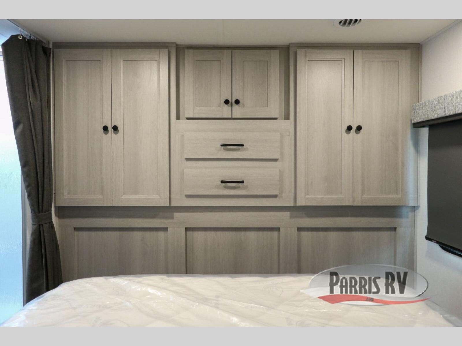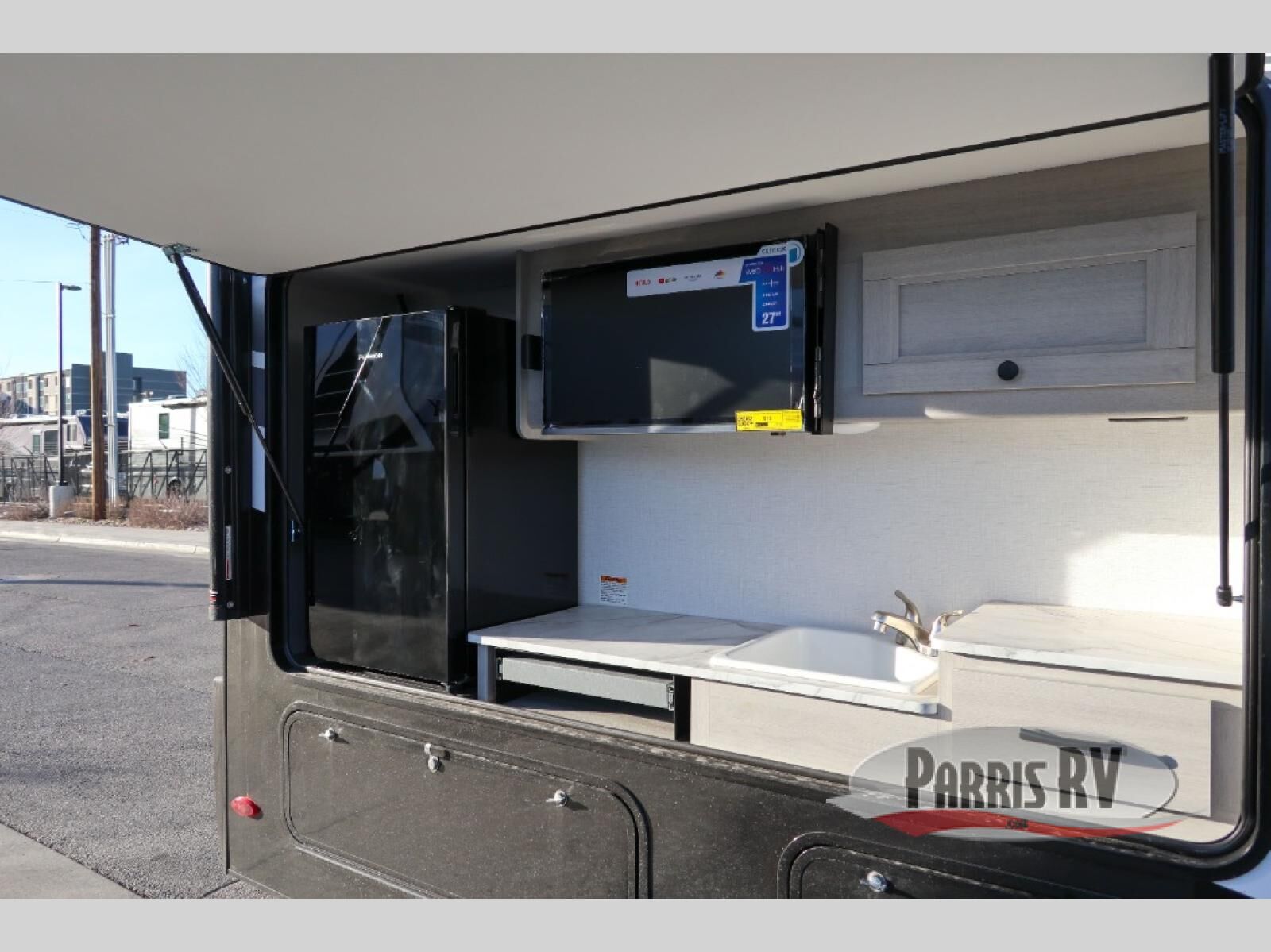 Pack your bags and pick your favorite destination then head out in this motorhome! The rear private bedroom has a 60" x 74" queen bed slide for more interior space, and a linen closet with wardrobes on either side of it. There is also a split-style bath with a private toilet and sink, and the shower is right across the hall. Prepare your best home cooked meals using the three burner cooktop, enjoy dining at the booth dinette, and store any leftovers in the 10.7 cu. ft. 12V refrigerator. You will also appreciate the outside kitchen with a refrigerator and cooktop plus an outside TV to watch the big game. Relax each evening on the sofa slide out, or you can replace it for the optional power theater seating. There is even a 60" x 80" bunk over the cab for extra sleeping or storage space!