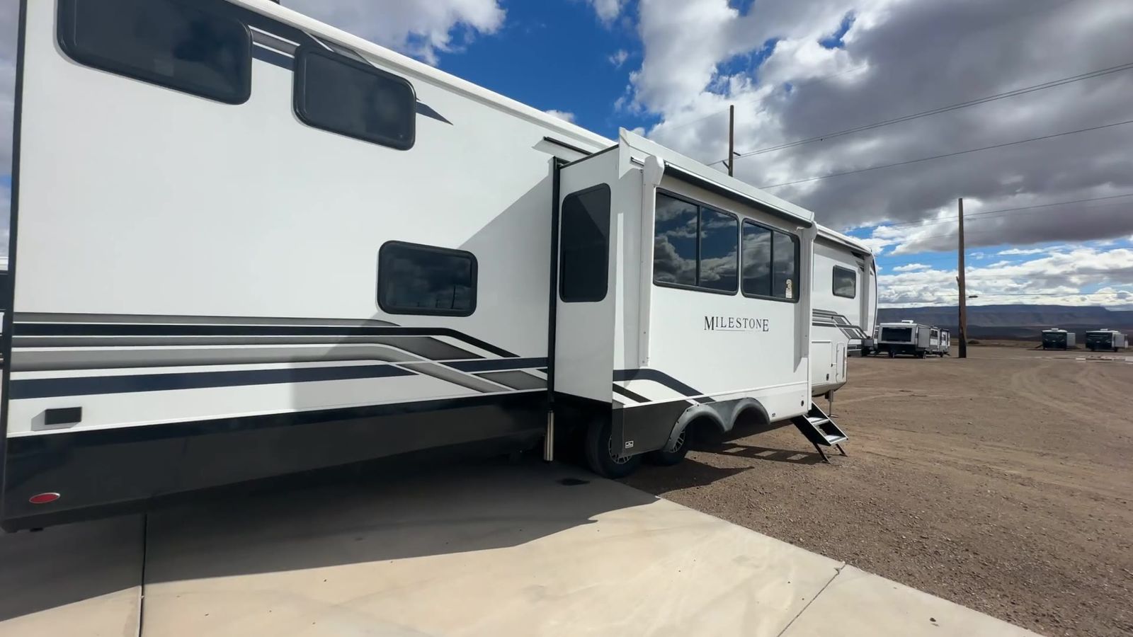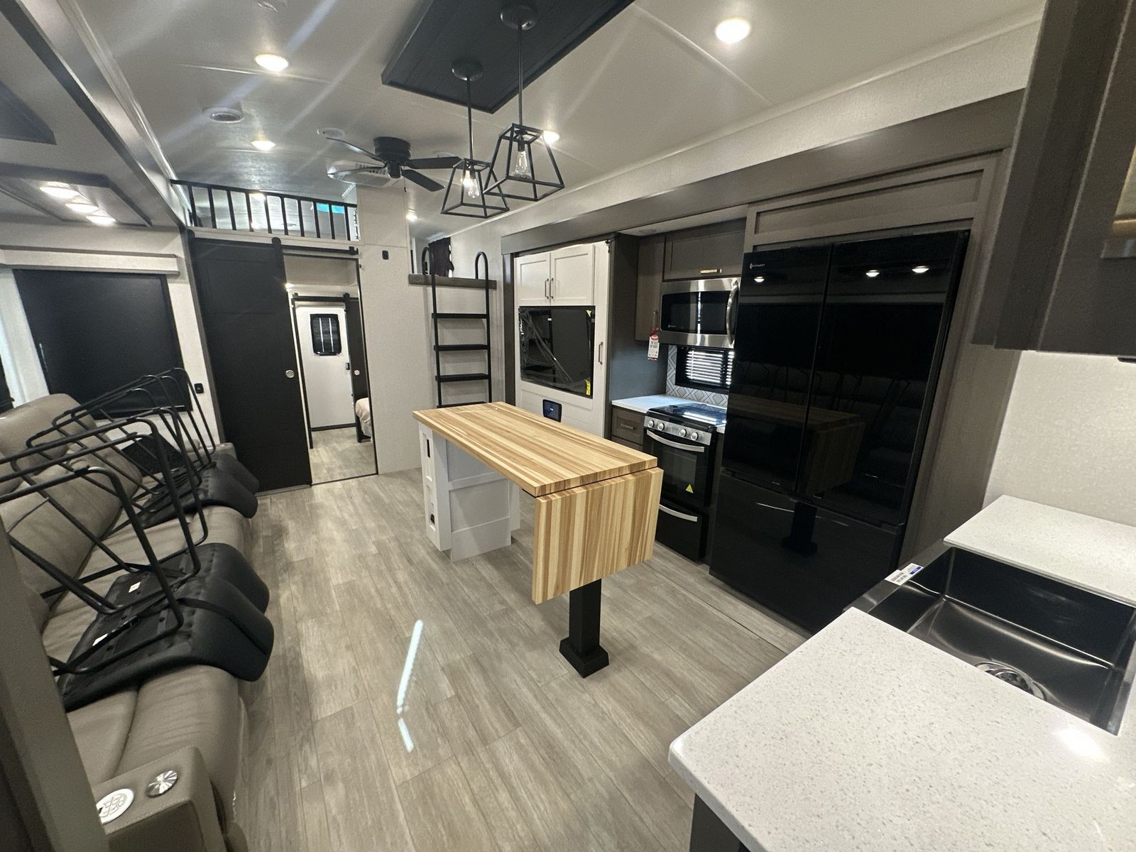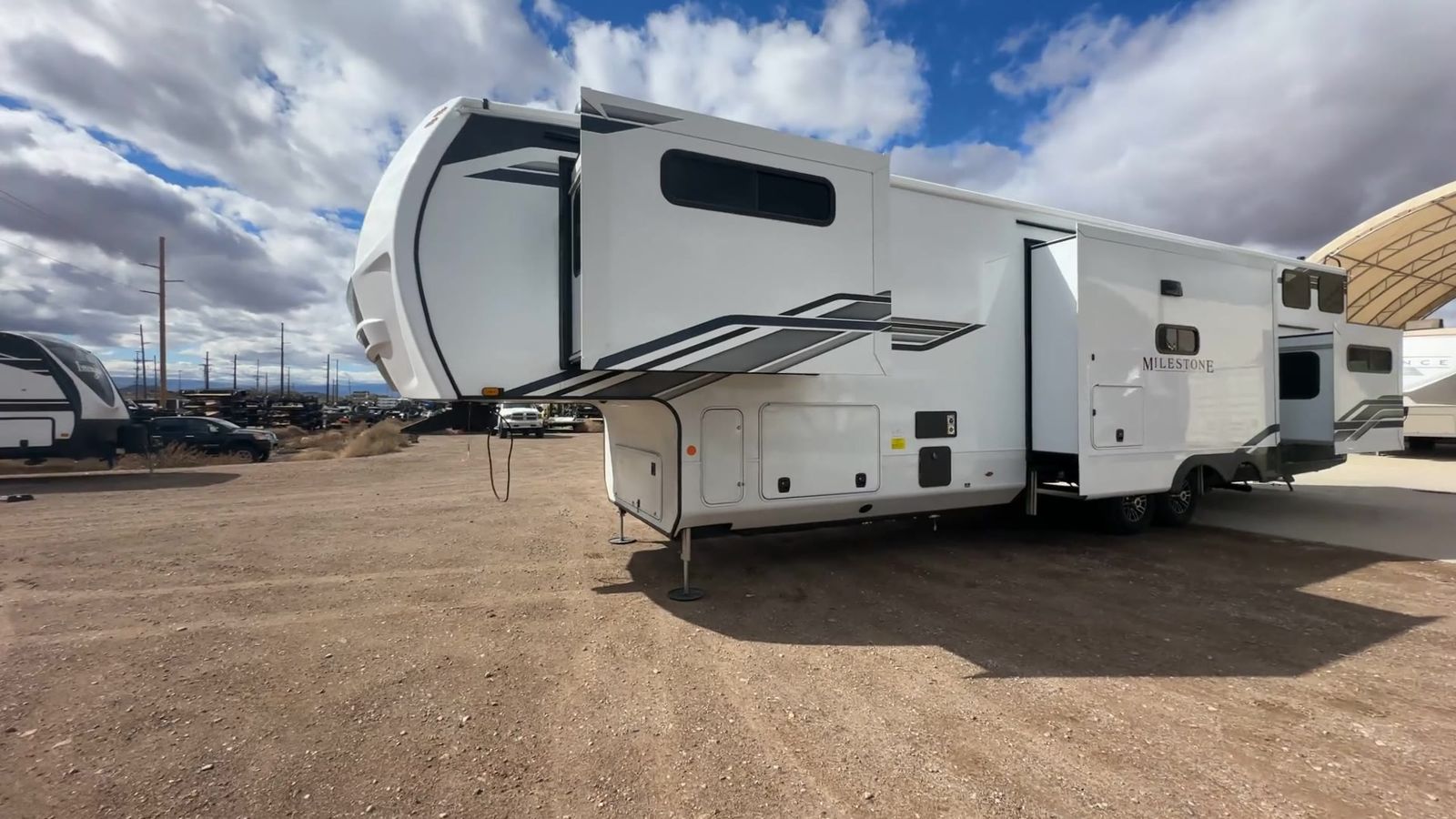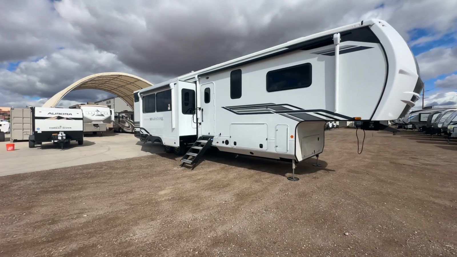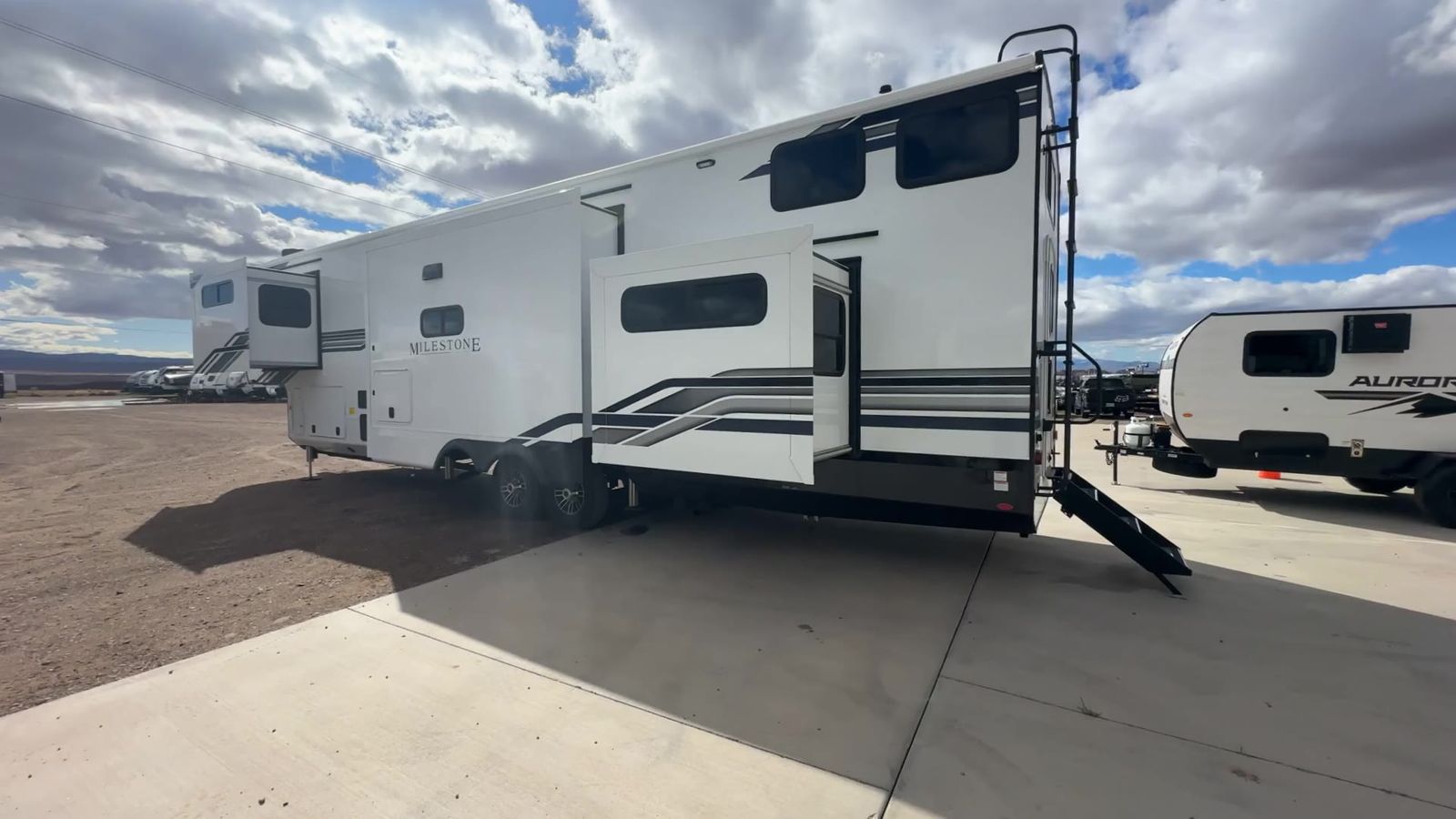 Heartland Milestone fifth wheel 39TB highlights: Loft 4K Smart LED HDTV Island Table Hidden Pantry You'll be shocked with how many people can travel in full luxury with this Milestone fifth wheel! There are dualprivate bedrooms featuring aking-size bedin the front bedroom and a queen-size bed in the rear bedroom so you and your guests can have their own space. Use the loft for added sleeping space for the kiddos! This RV also has two full bathrooms on each end so it is of easy access, also, the rear bathroom has its own exterior entrance! The kitchen has all the counter space you will need to prepare your everyday meals, after cooking you can enjoy your creation at the island table with chairs.There is a super lounger that has all the space you'll need to enjoy quality time with all of your guests!Enjoya wonderful design featuring dual opposing slides that will make for the real residential experience and make the most out of your travel. The Heartland Milestone is a full-profile luxury fifth wheel that is ready to help you make the most of your adventures! You will find aTrussTXL Roof System with Alpha roof membrane system offering quality exterior protection,and thePower Up Solar that includes a200 watt solar panelwill let you go off-grid when the adventure calls for it. The upgradedMORryde Step Above entrance stepswill help you enter your unit with ease, and the6-point hydraulicauto-leveling systemcomes standard to help you keep your unit secure while camping. The interior kitchen has some great features, like residential solid surface countertopsand alarge farmhouse sink.There are roller night shadesthroughout each unit to have privacy and comfort.