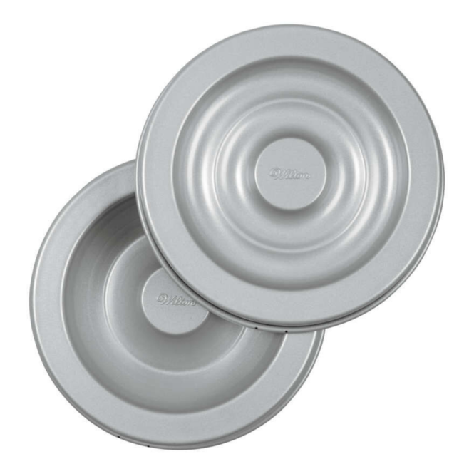 New two piece cake pan set with a tasty fill surprise heart center. Create a cake with a heart-shaped surprise center with this 2-piece non-stick round cake pan set with center cavity for creating filled cakes. Can use pans with your favorite cake mix or recipe then fill with mousse, whipped topping mixed with fruit or ice cream. Pan dimensions: two 8.25 x 2.25 in. (20.9 x 5.7 cm) sized pans with recessed centers.