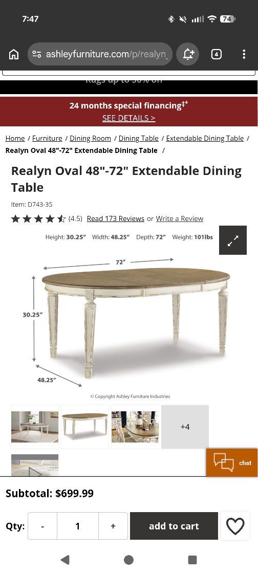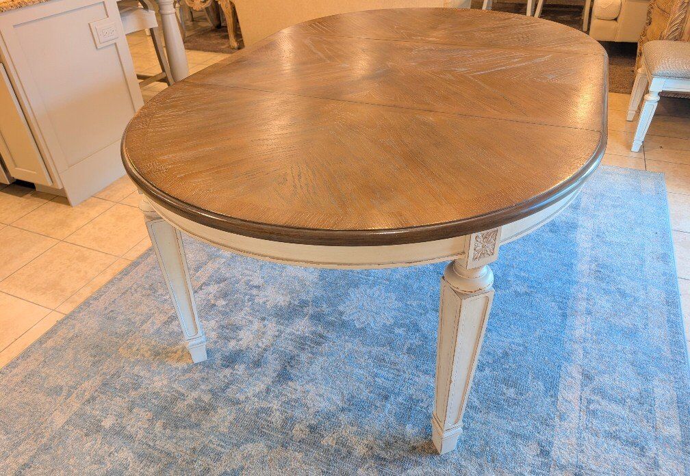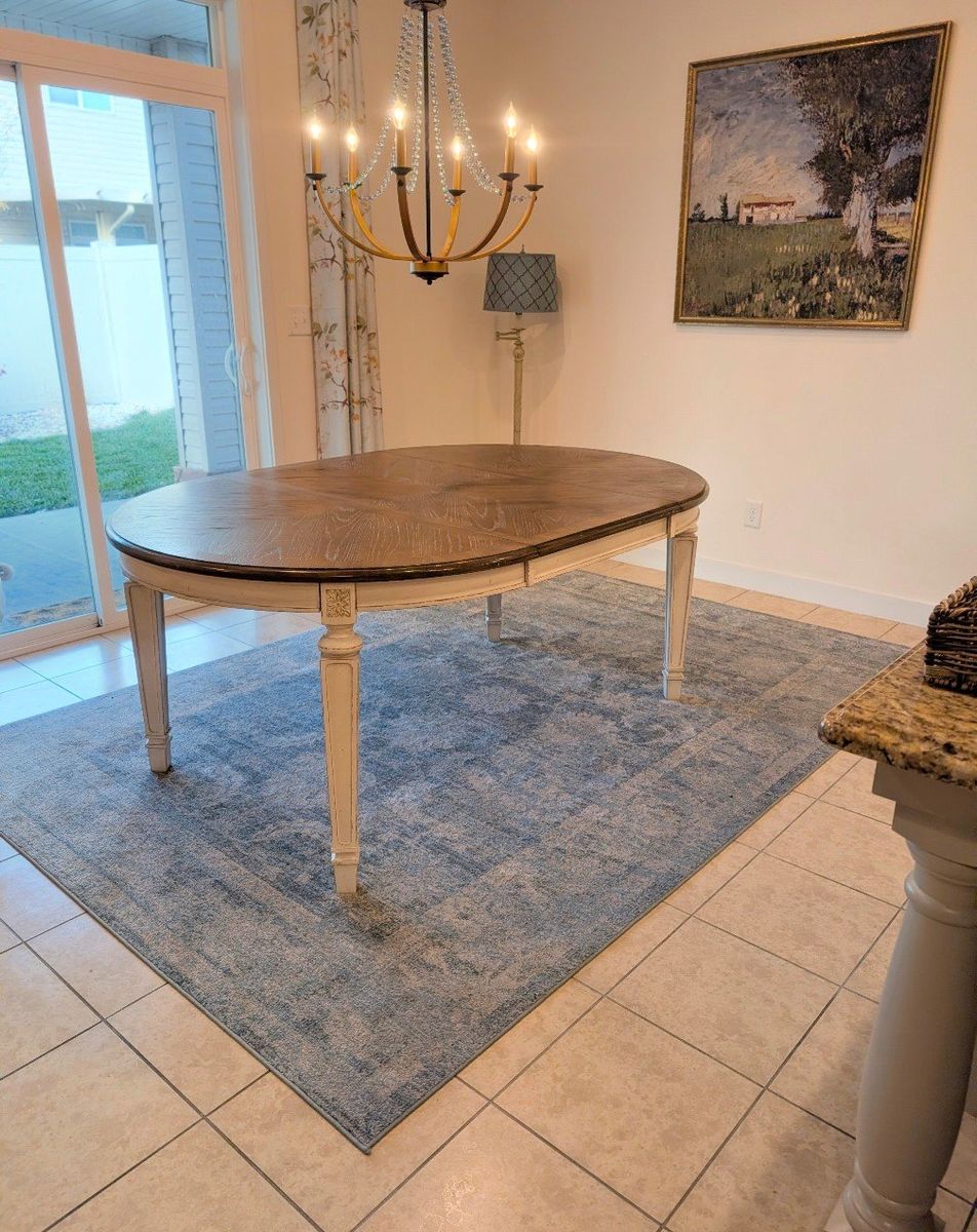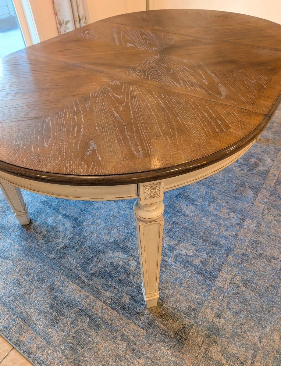 This beautiful table is priced to sell. Presently out of stock and hard to get. In very good condition. 72x48 with the leaf in and 48 round with the leaf out. $350