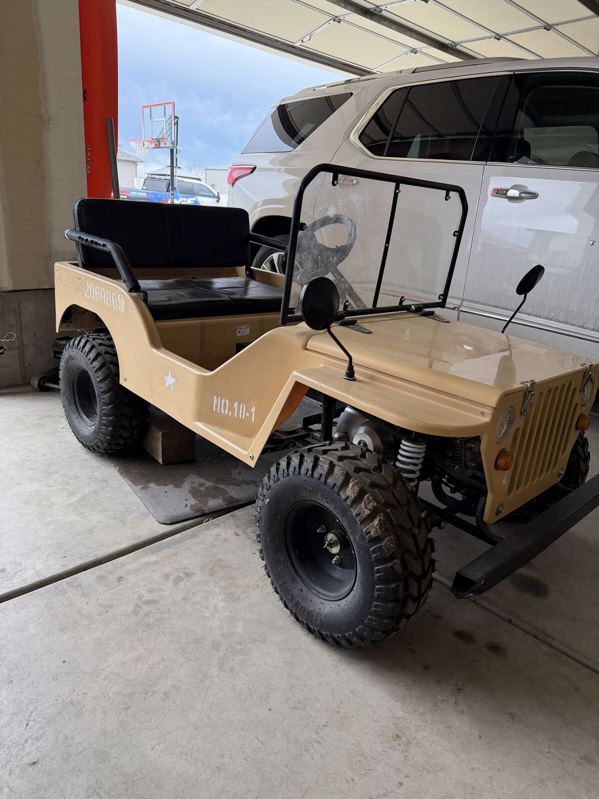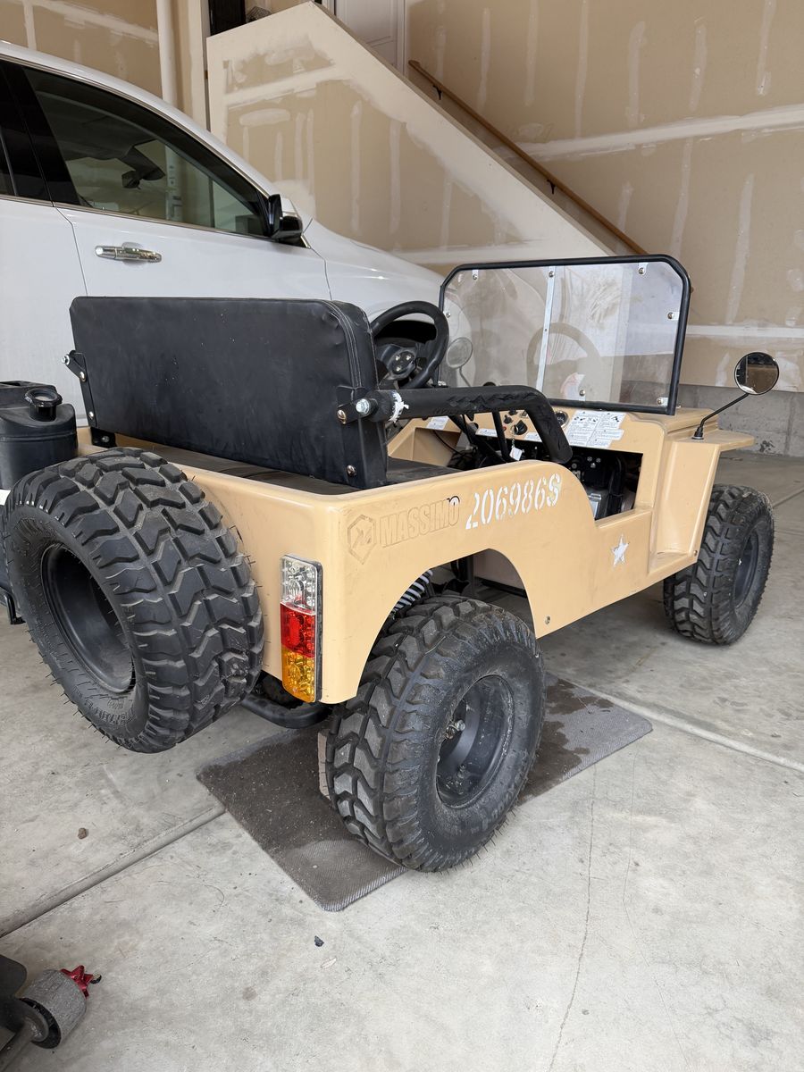 VenmoMassimo brand mini jeep. Has a 3-spd with reverse. Electric start. We’ve owned it about two years but our boys interest has shifted to dirt bikes so this just sat all winter. It starts right up but will need a carb tune up. It’s idling high currently. The plastic floor is cracked and broken and it his a small oil leak.