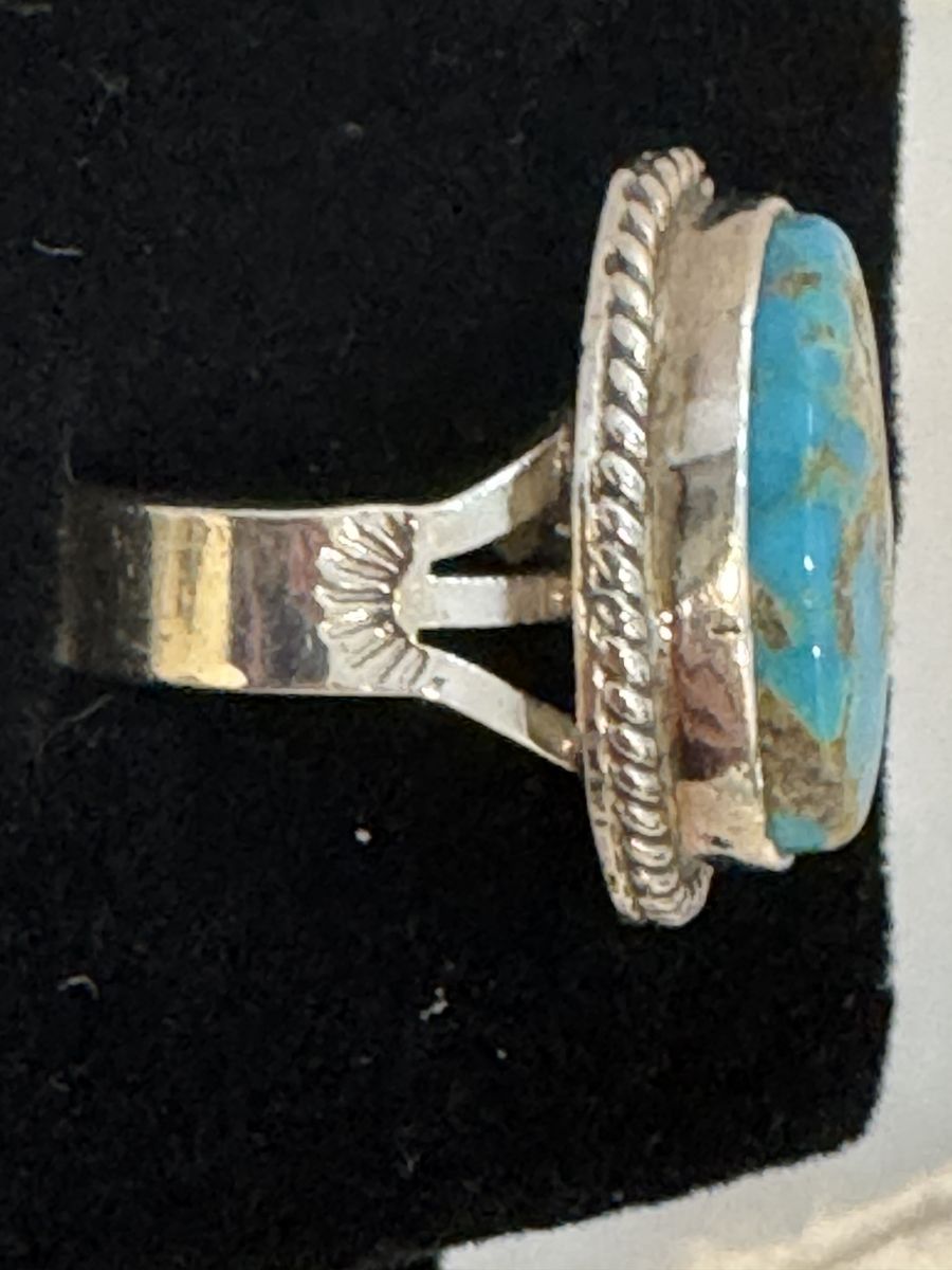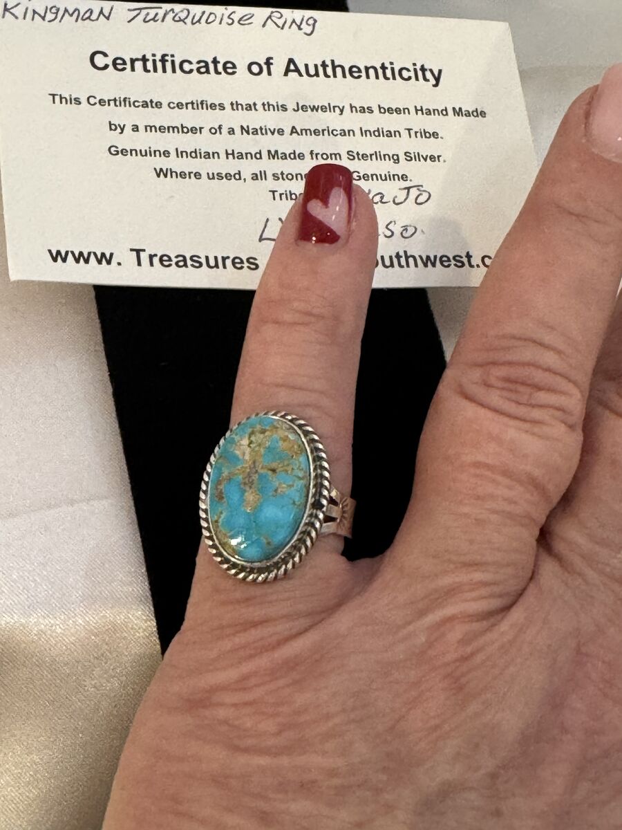 The stone in this ring comes from the Kingman Mine in Mohave County, Arizona, which is one of the oldest and most productive turquoise mines in the United States.