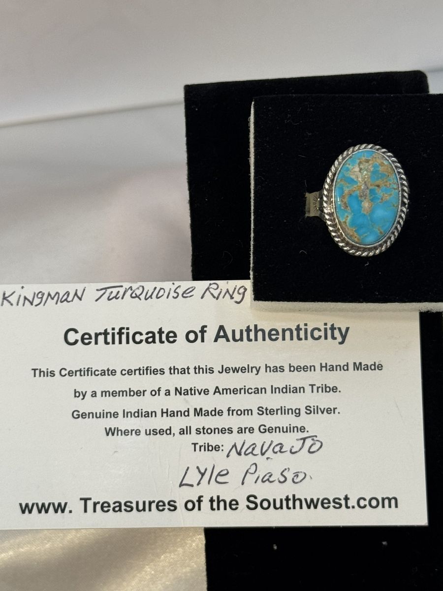This is a Navajo handmade sterling silver ring featuring Kingman turquoise and a twisted rope border, crafted by artist Lyle Piaso.