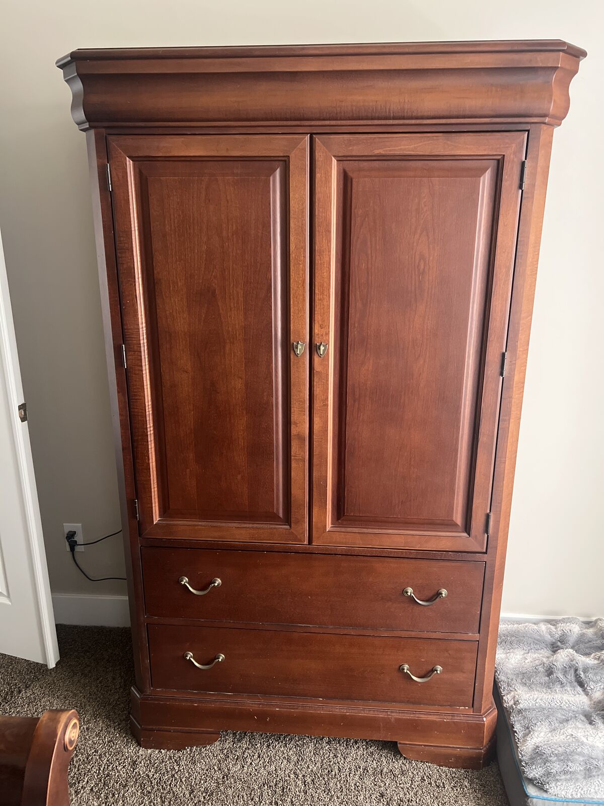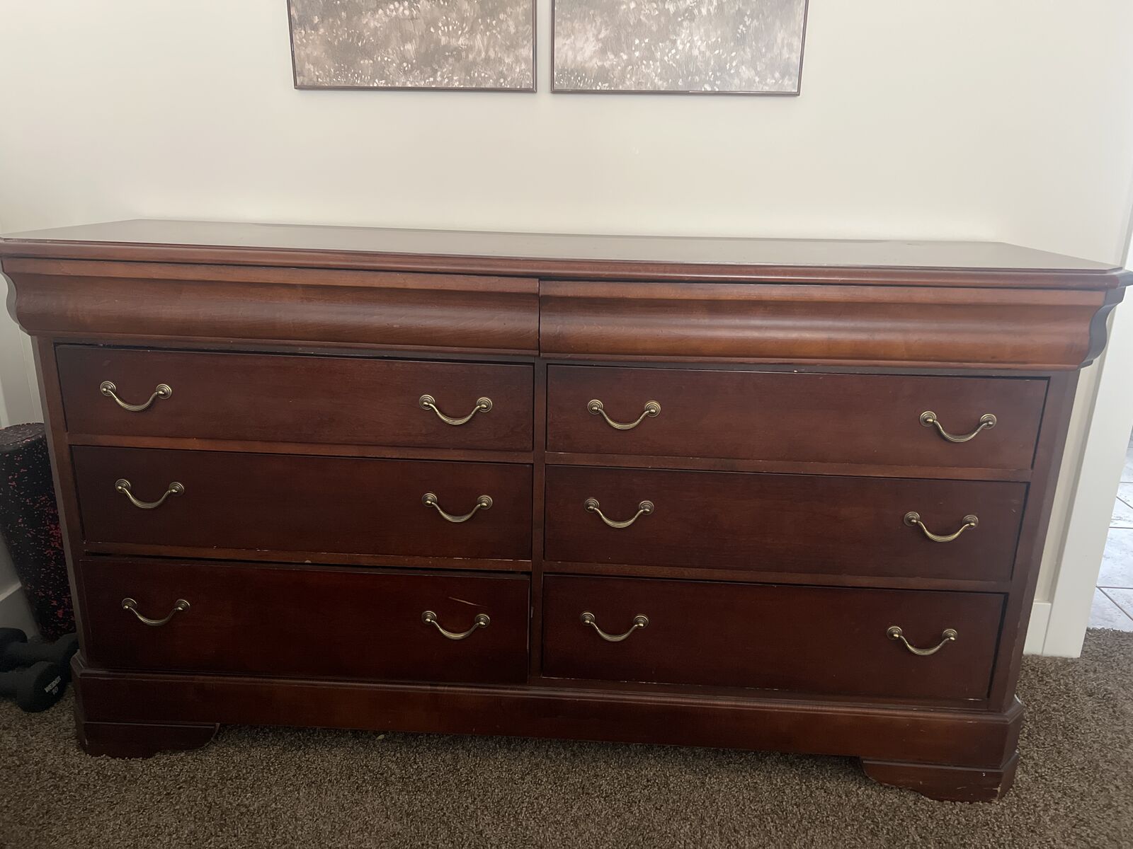 VenmoSet includes a traditional sleigh king bed frame with headboard, footboard, and wooden rails. A dresser with 6 large drawers and 2 small drawers. A TV hutch with 3 drawers. And a nightstand. The furniture is very well made with cherry wood and is very sturdy. The footboard has some scratches on the inside by the mattress and the TV hutch has a mark on one side from a yoga ball.