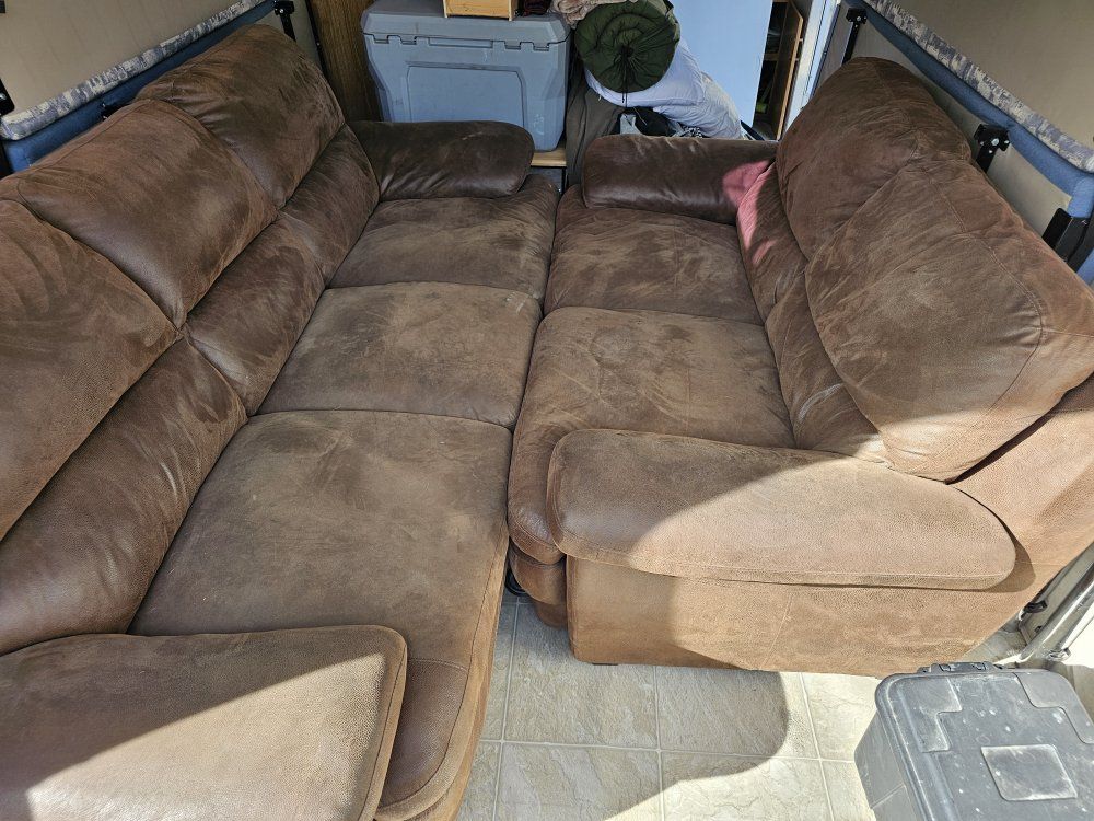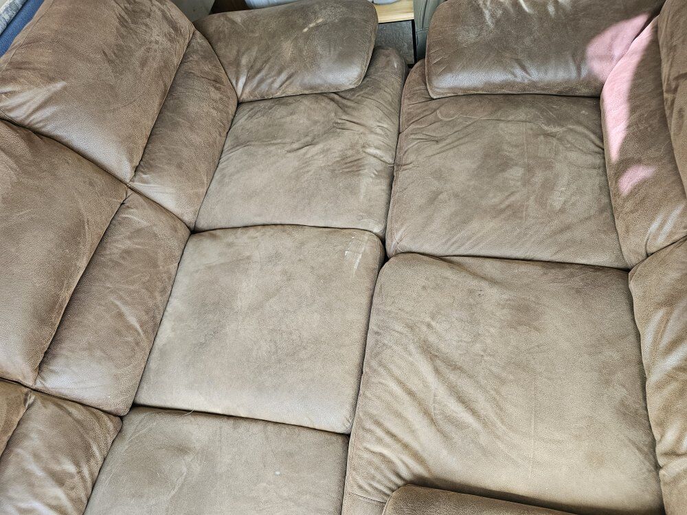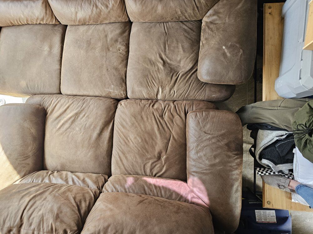 PayPalBrown suede couch set, in fair condition. Wear on cushions & springs, few stains, small tear along bottom. Smoke free home.