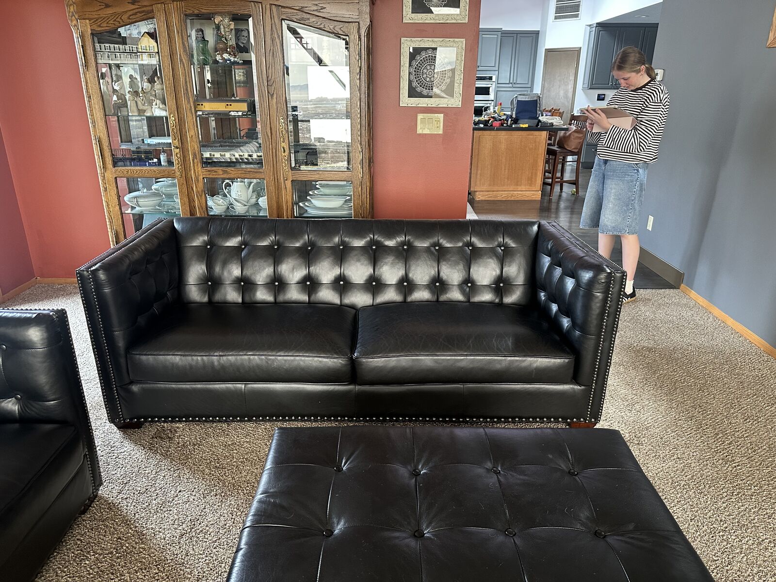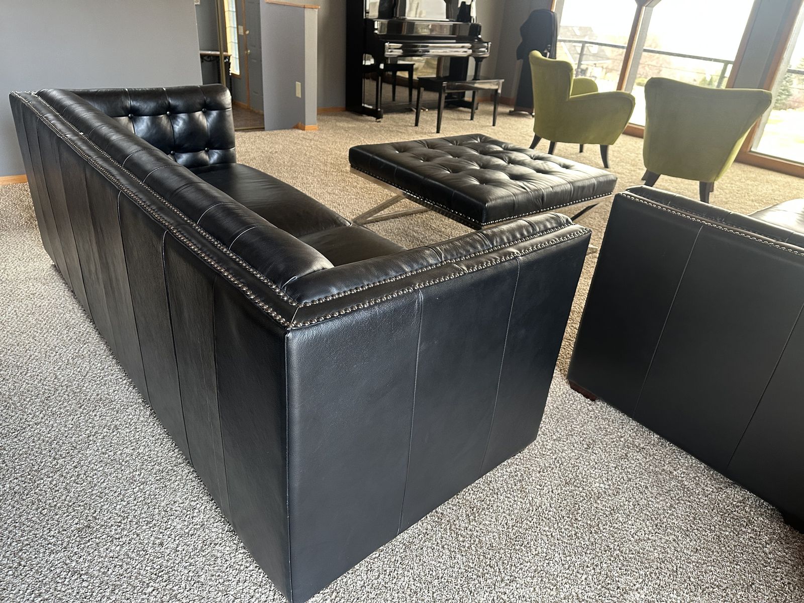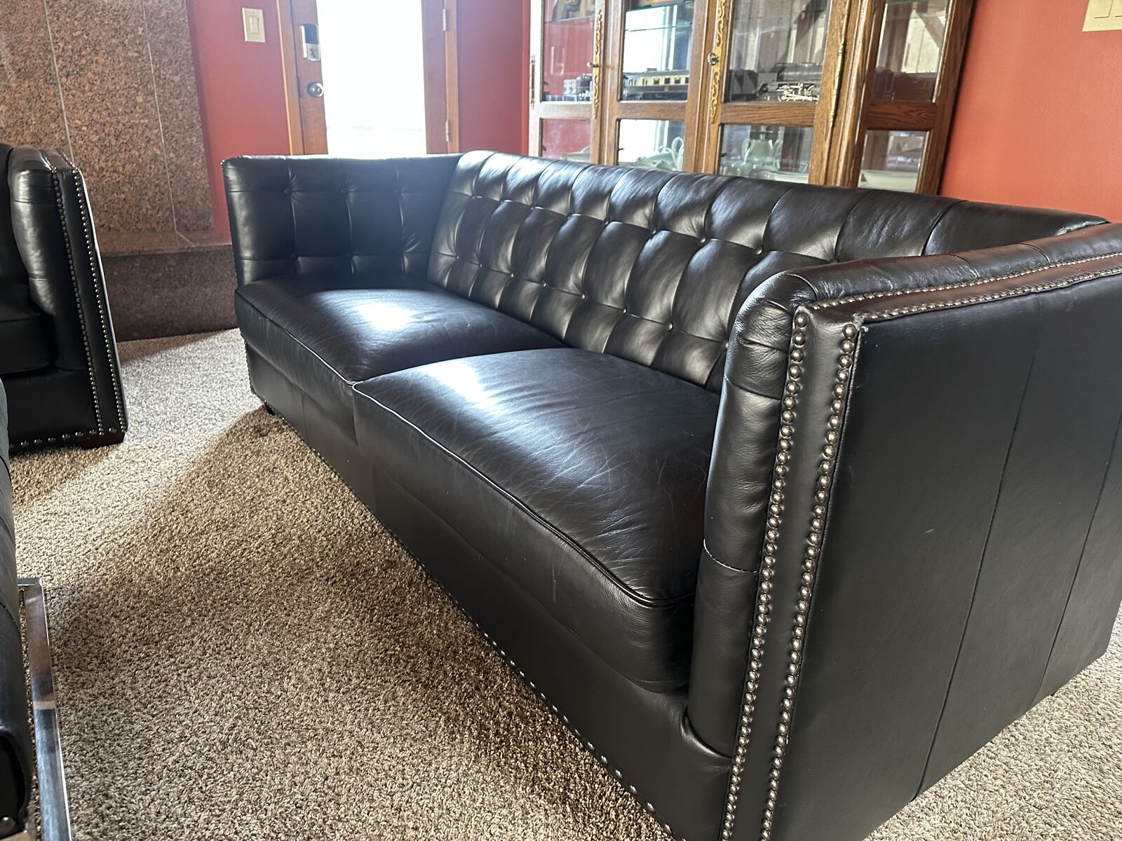 Venmo(2)- Studded Black Leather Sofas and Diamond tuck center table/ foot rest. All are in extremely good condition. No holes, tears or scratches.