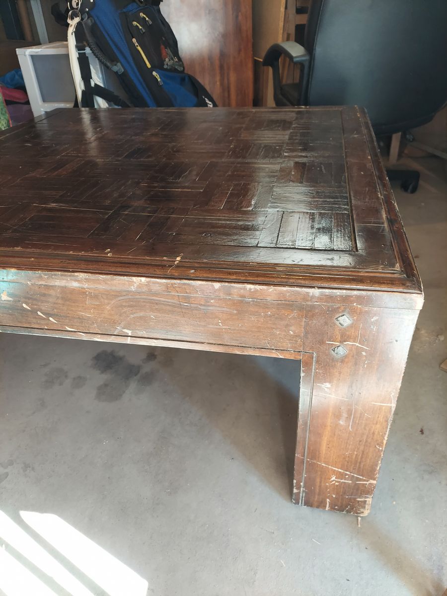 VenmoRustic wood coffee table. Has a cool parquet pattern on the top. Square shape, dark wood. Lots of character, could be a fun DIY project to refinish or just use as is for a distressed vibe.