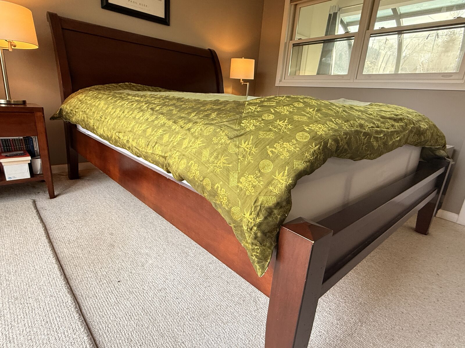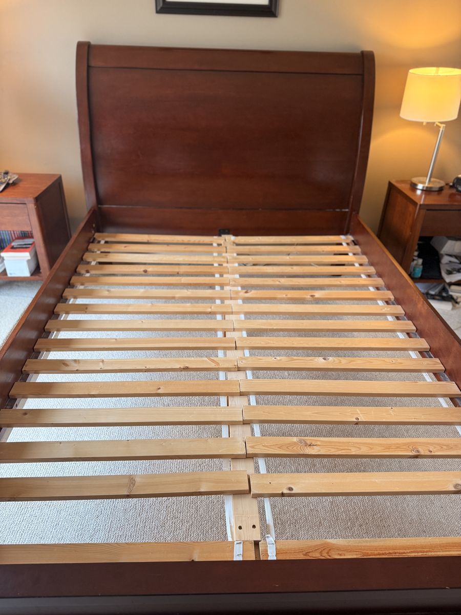 VenmoThis bed frame has a deep and lustrous grain and color, and is incredibly comfortable to read and sleep in. All parts included and in good working order. Excellent condition.