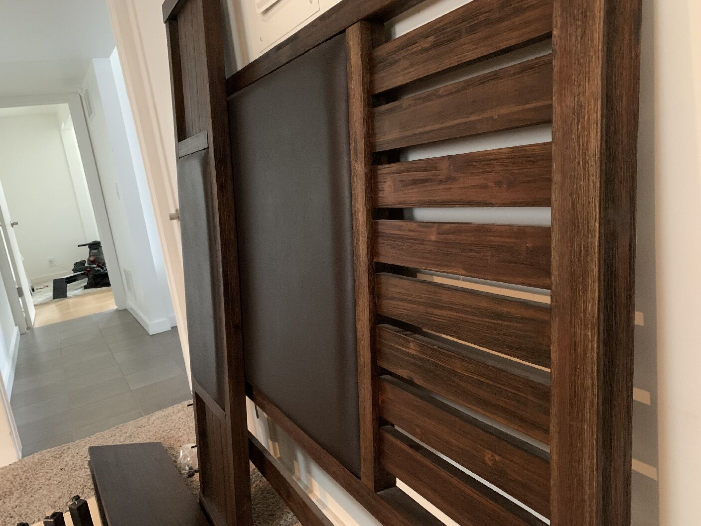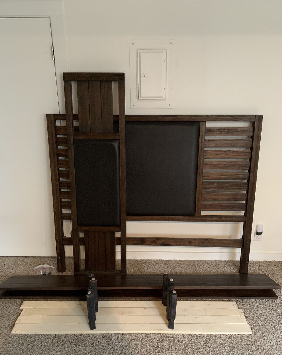 VenmoSolid wood with a faux leather backing. Great condition except for a minor sctach on the side boarding, and one of the support legs on the slats had cracked and been glued (frame has operated in this way for years without issue).