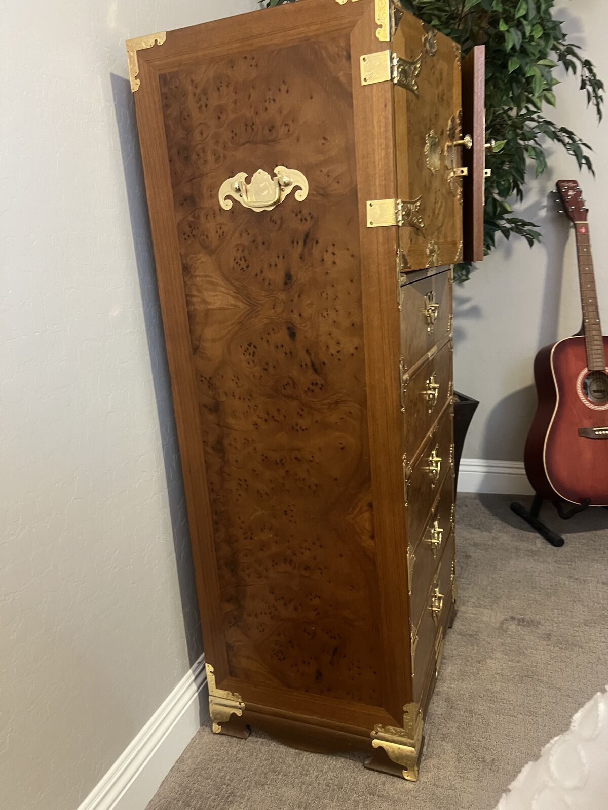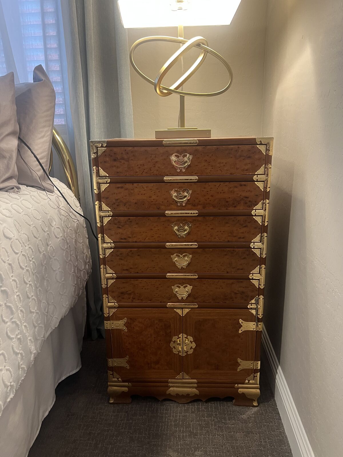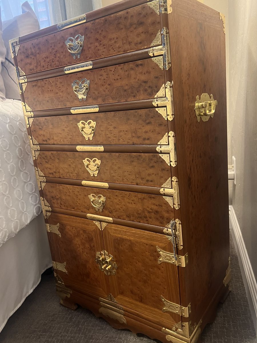 ZelleThree Vintage Chinoiserie Teak & Burl Brass Mounted Chests, Mirror, and Brass Headboard. $1,500 OBO Condition is Used Excellent- Like New