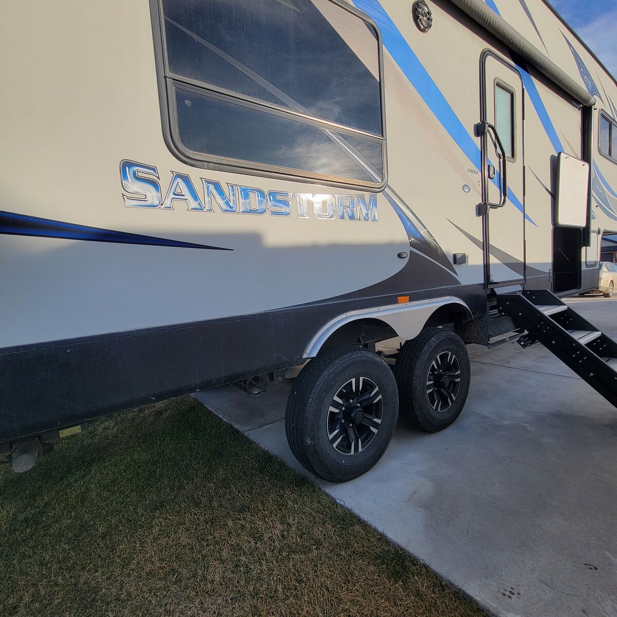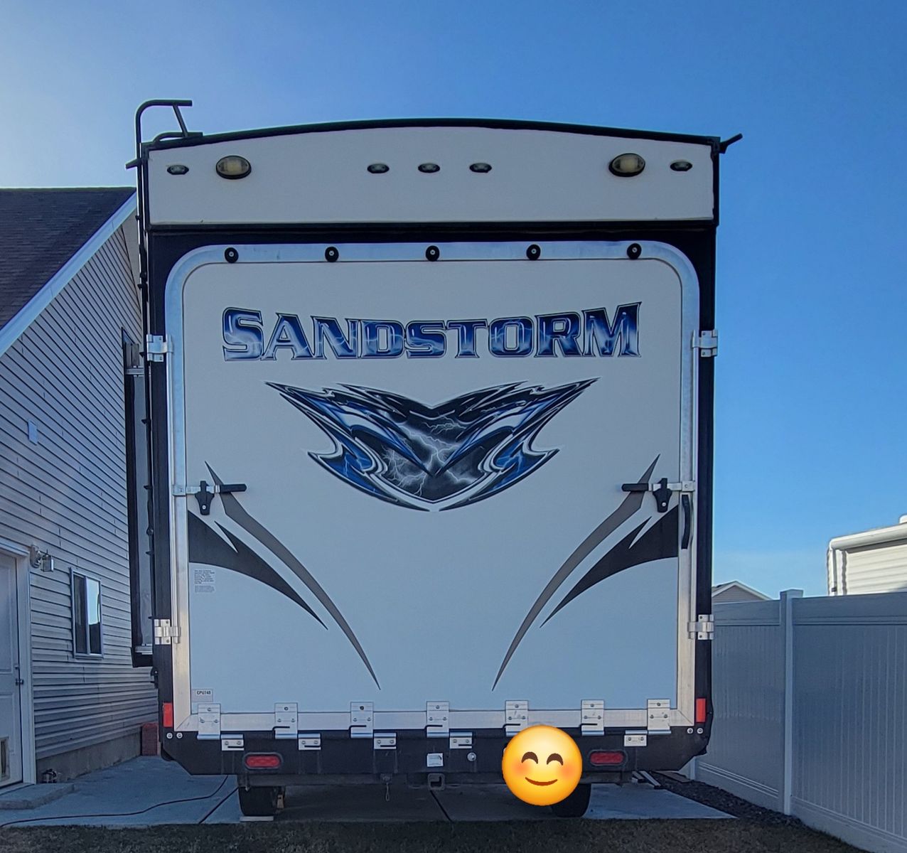 2018 Forest River Sandstorm F286SLR-G series.Very clean, versatile toy hauler with all the extras you would ever need! It has a 16 foot garage, a 4inch lift works well with taller pickups. It will fit a 4-seater Canam or Razr. Fully equipped with on board generator with 198 hours, solar panels, 35 gallon fuel cell, 100+ gallon fresh water tank, 2 slide-outs, gas/electric fridge, an A/C unit, 2 captains chairs, 3 tables, queen size master bed, heavy duty lippert stairs, electric awning, TV with built in dvd player/ indoor-outdoor stereo, 2 inch hitch receiver for towing extra trailer, and tires only have 1 season on them.
