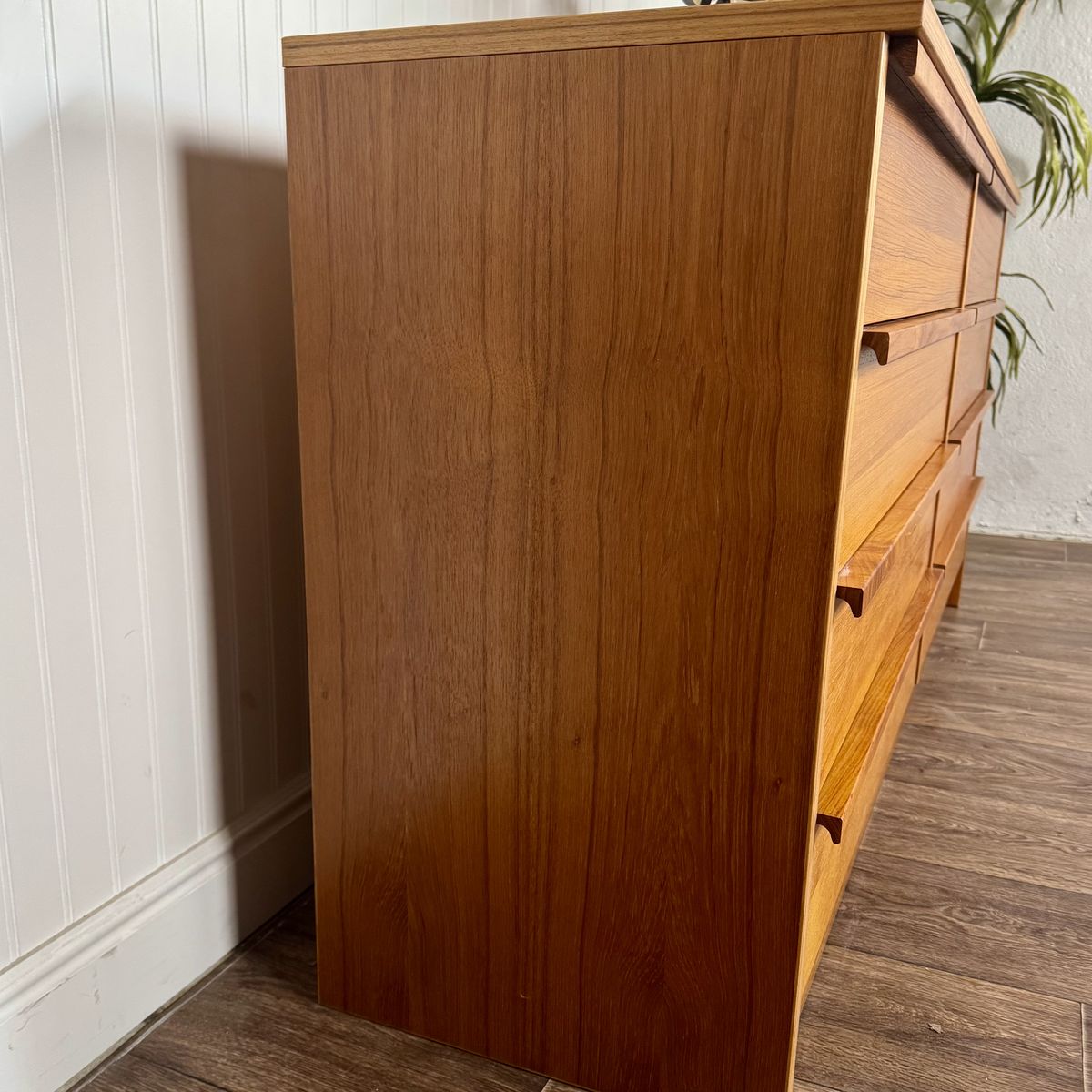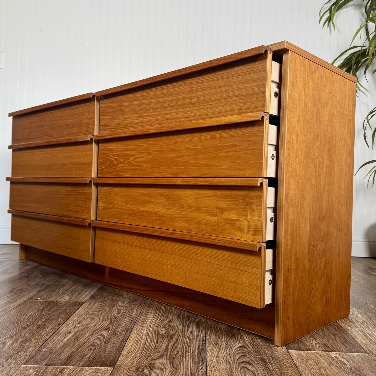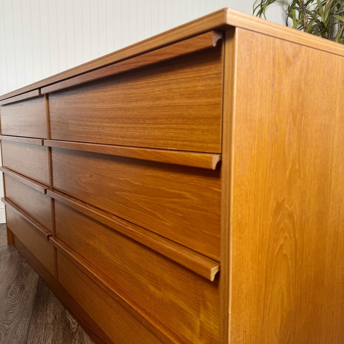VenmoVintage teak dresser with classic Danish modern lines and exceptional proportions. Features 8 spacious drawers, integrated lip pulls, a clean plinth base, and warm teak grain.