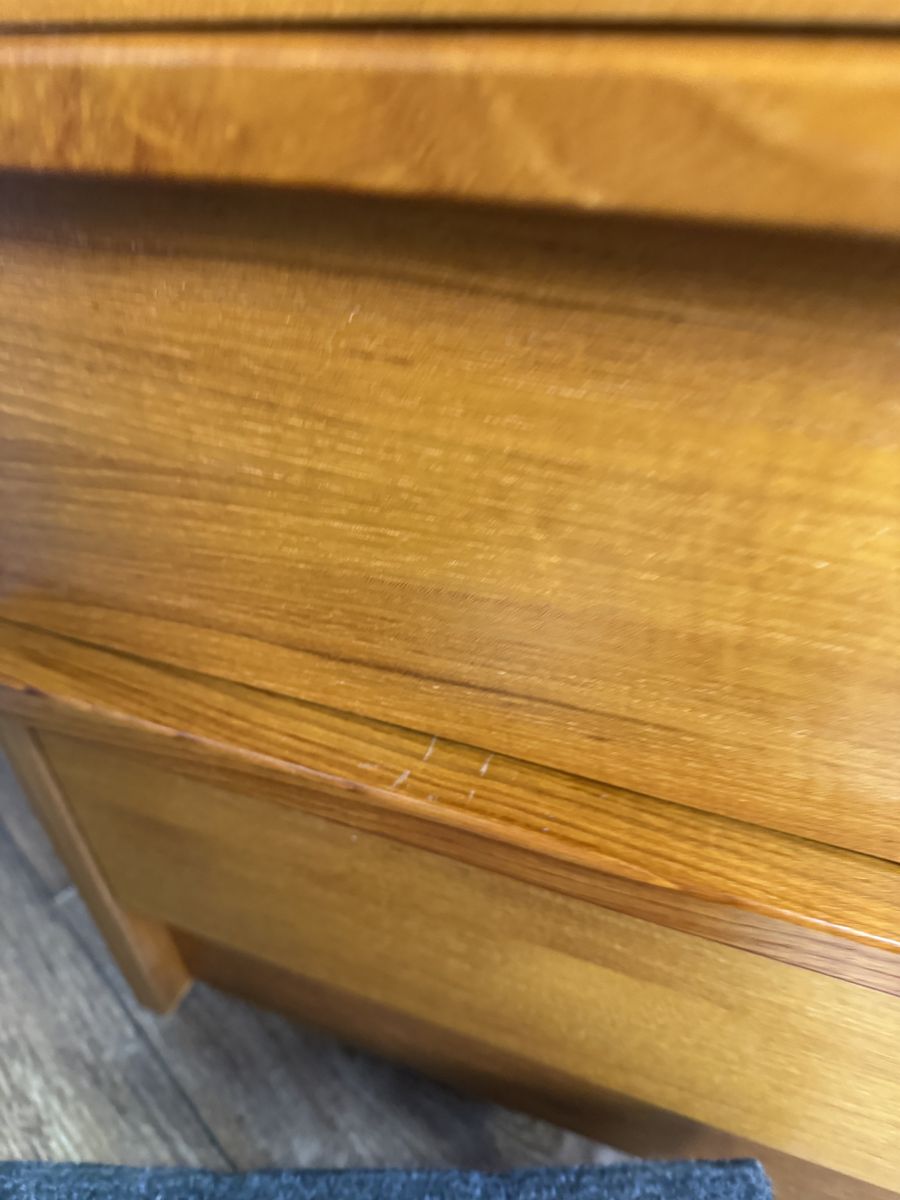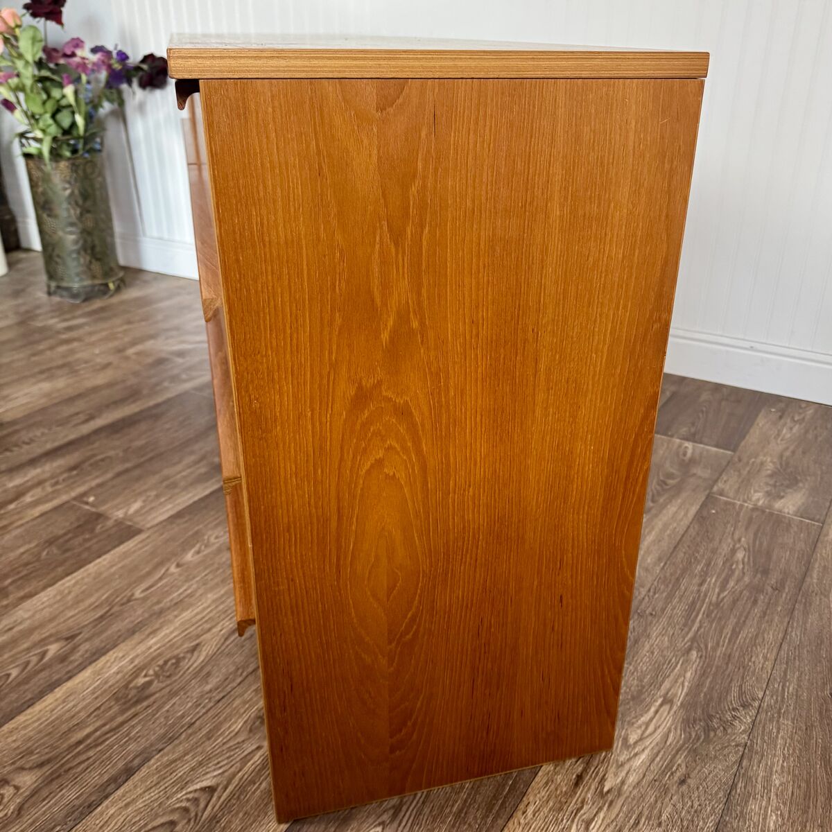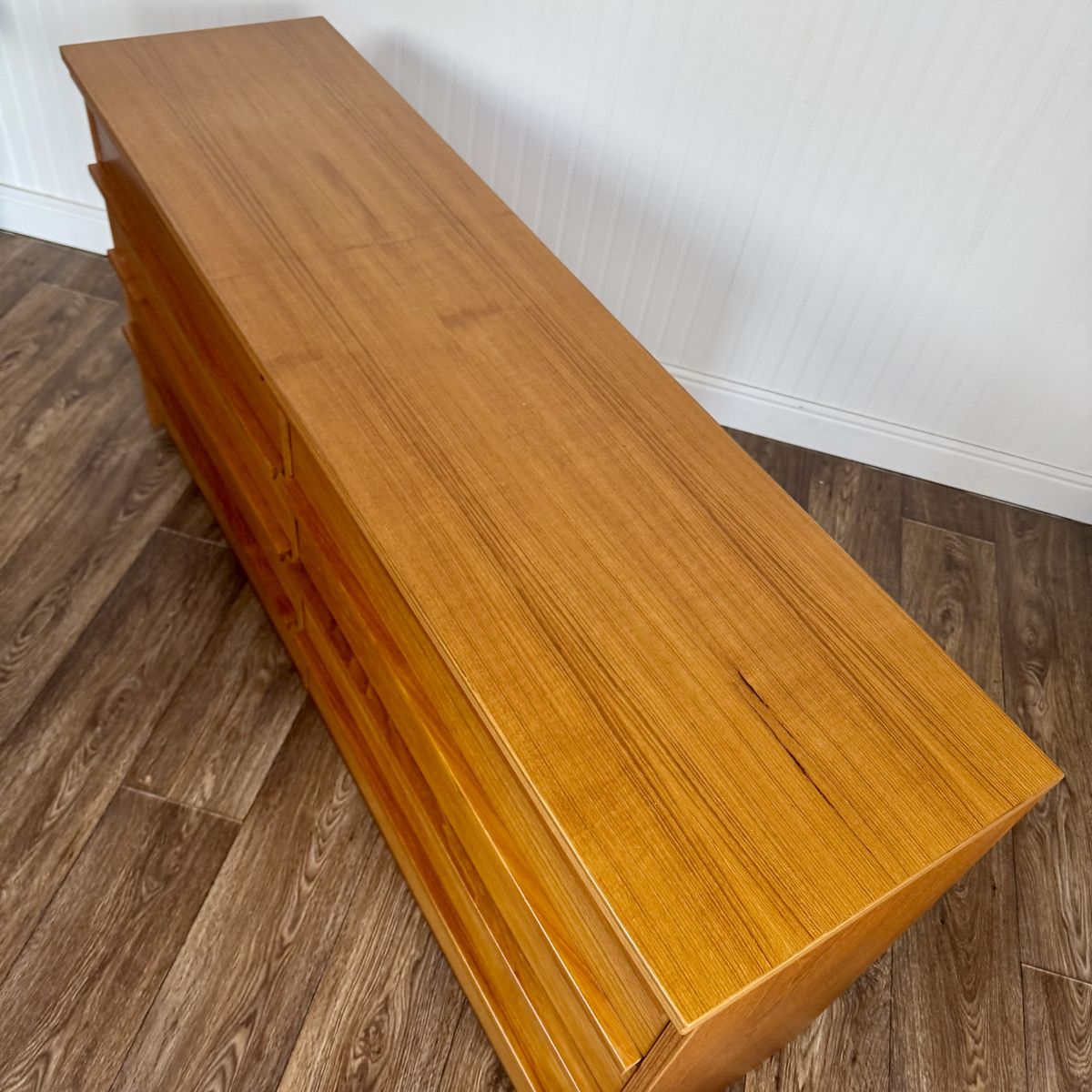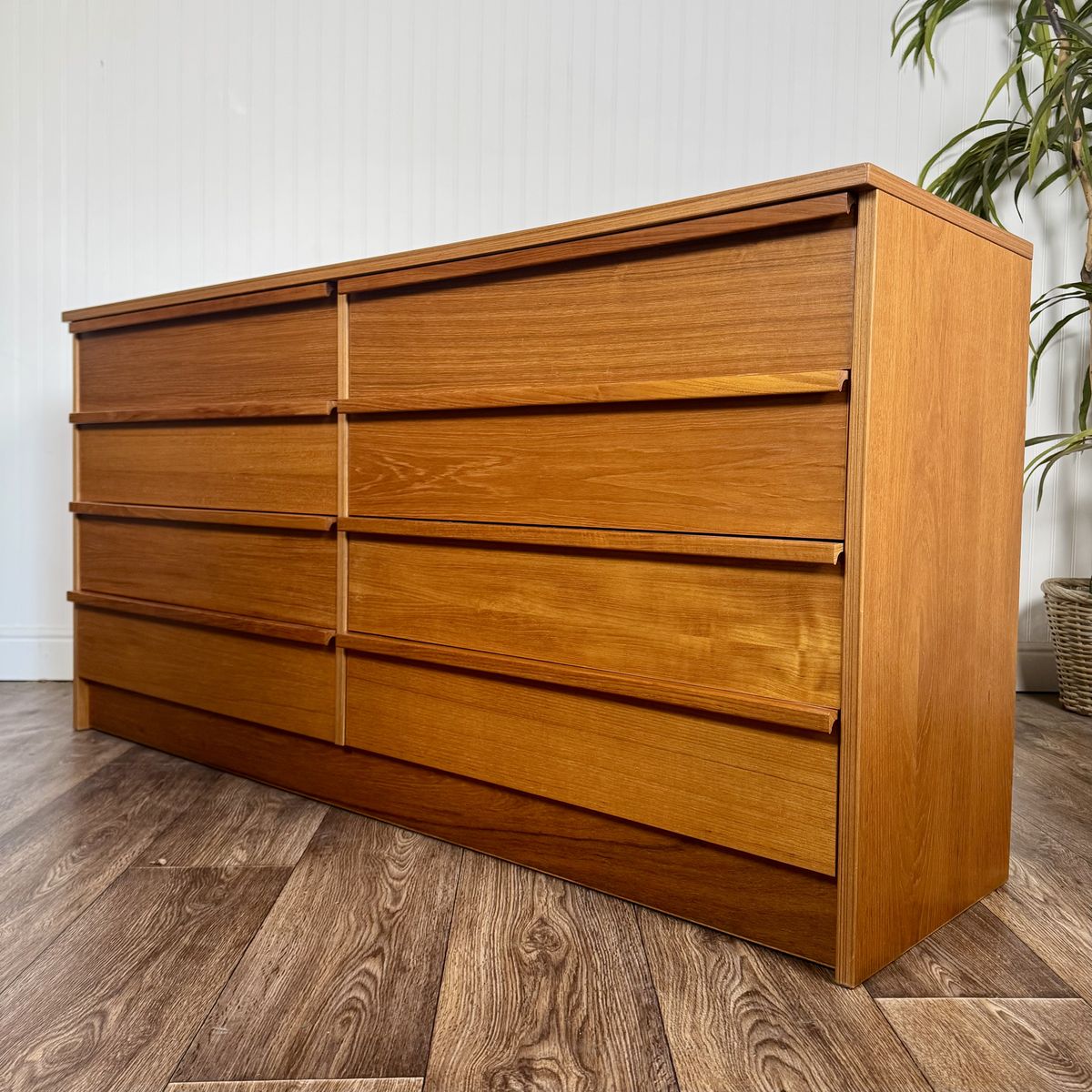 VenmoVintage teak dresser with classic Danish modern lines and exceptional proportions. Features 8 spacious drawers, integrated lip pulls, a clean plinth base, and warm teak grain.