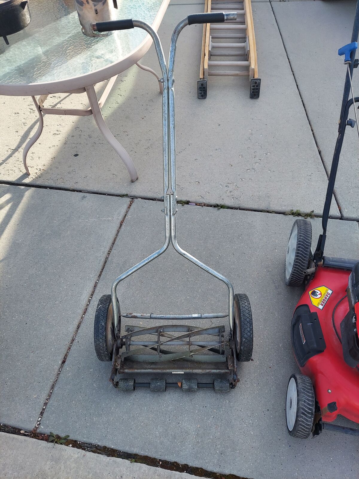 VenmoClassic manual reel push mower. Great for small yards or just wanting to get a little exercise while mowing. Has metal frame and rubber wheels.