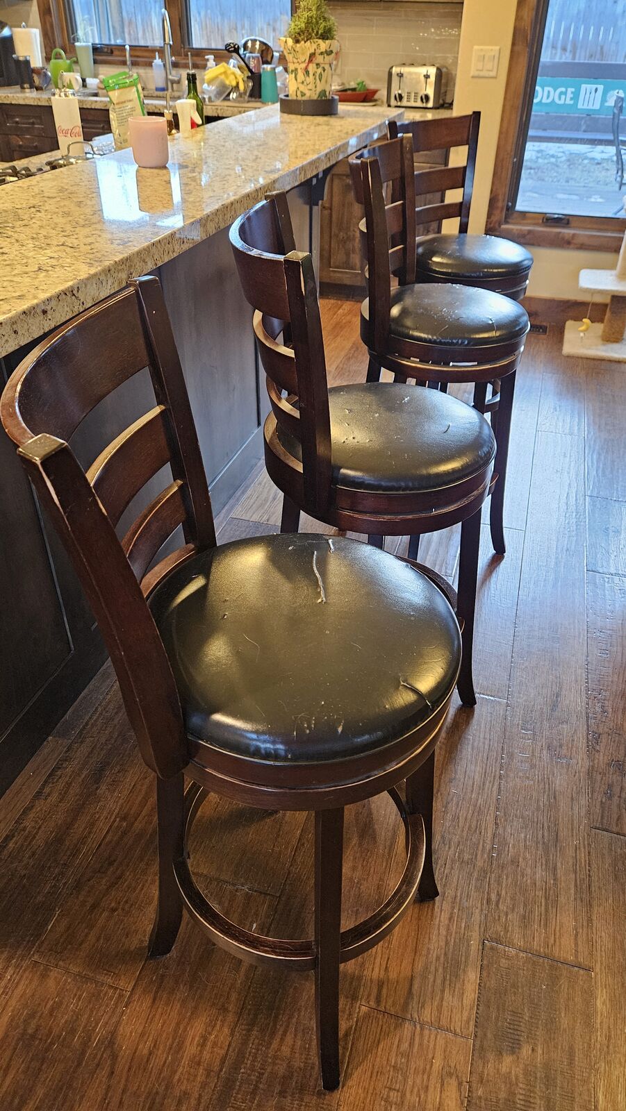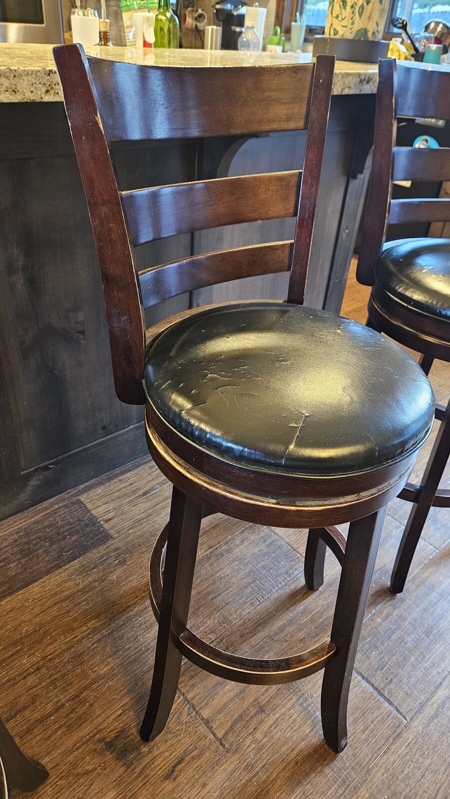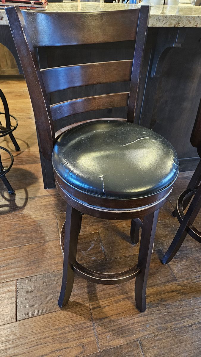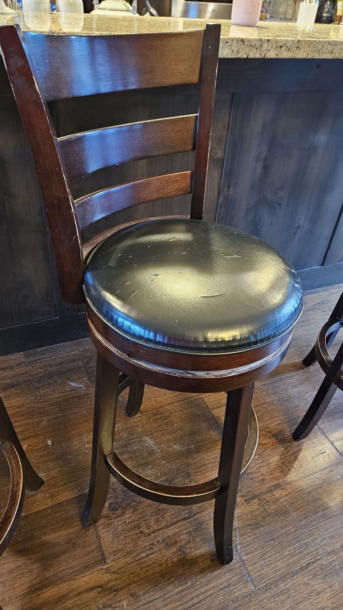 Set of 4 wooden barstools with faux leather seat. Some scratches and tears as shown in photo. First to come get them, they are yours.