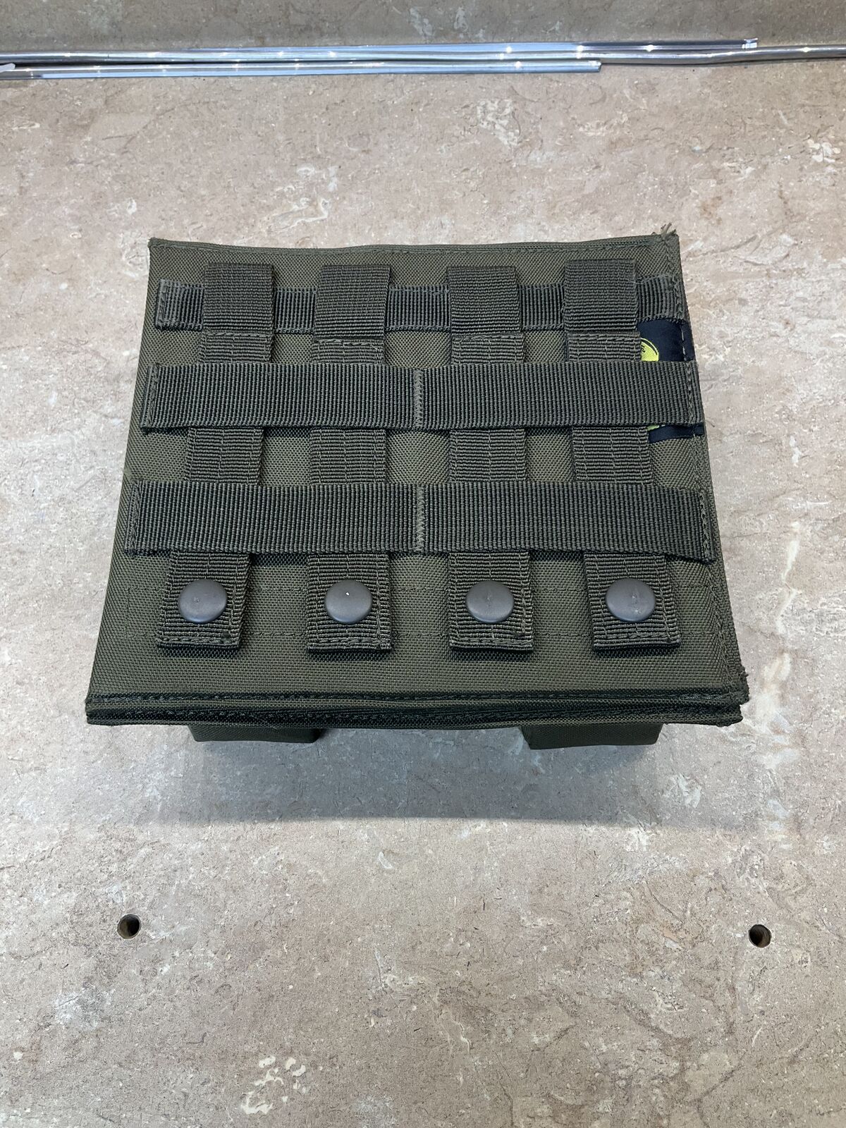 Made to attach to tactical pack using molle straps. Unused, olive green color. Lightweight. Can velcro on and off from the molle strap mount when not being used.