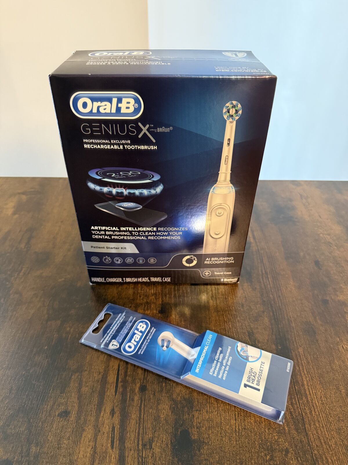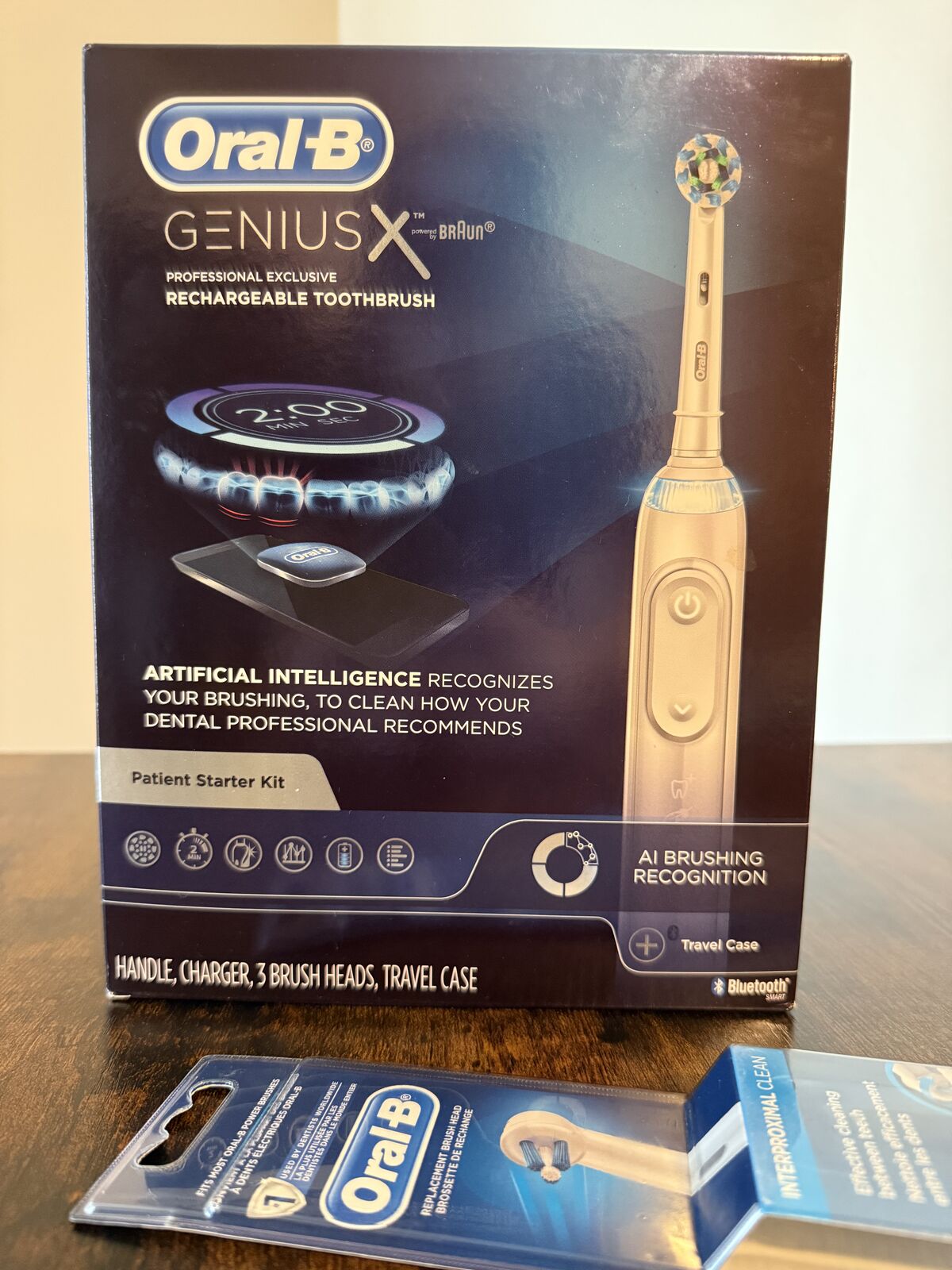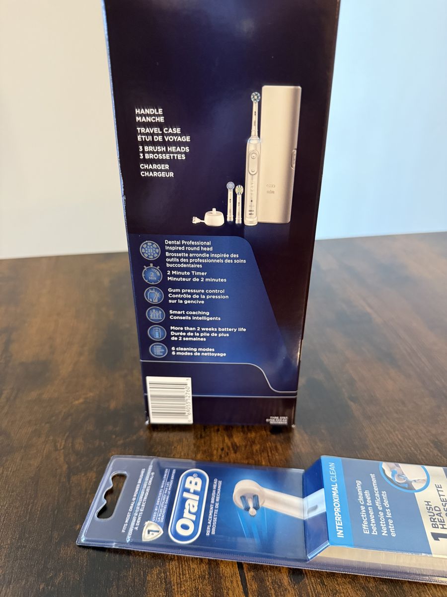 Includes: Handle, charger, 4 brush heads and a travel case.