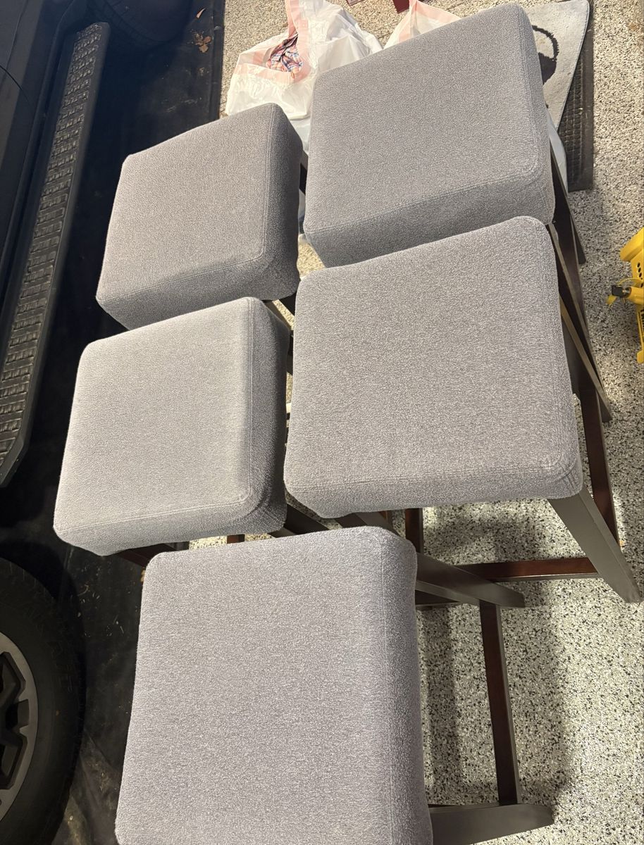 VenmoFive (5) stools. Grey fabric seat. Wood frame.