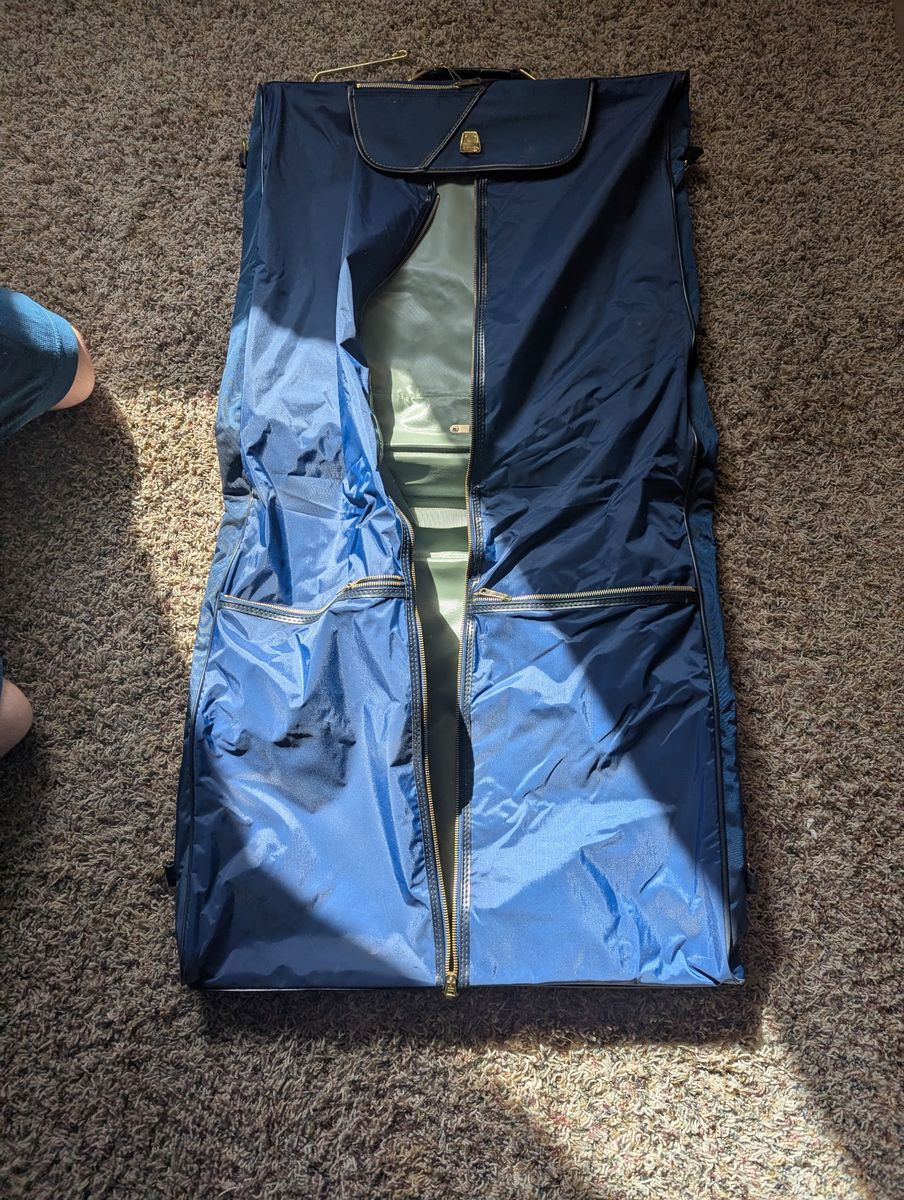VenmoThe Navy Blue Travel/Garment Bag by Jaguar is a stylish and practical addition to your luggage collection. With a solid navy blue color and adjustable straps, it offers a sleek and versatile option for travel or everyday use. The expandable design, clothing compartment, and locking feature provide added functionality and security for your belongings. Suitable for both men and women, this garment bag is perfect for carrying your clothes and essentials while on the go.