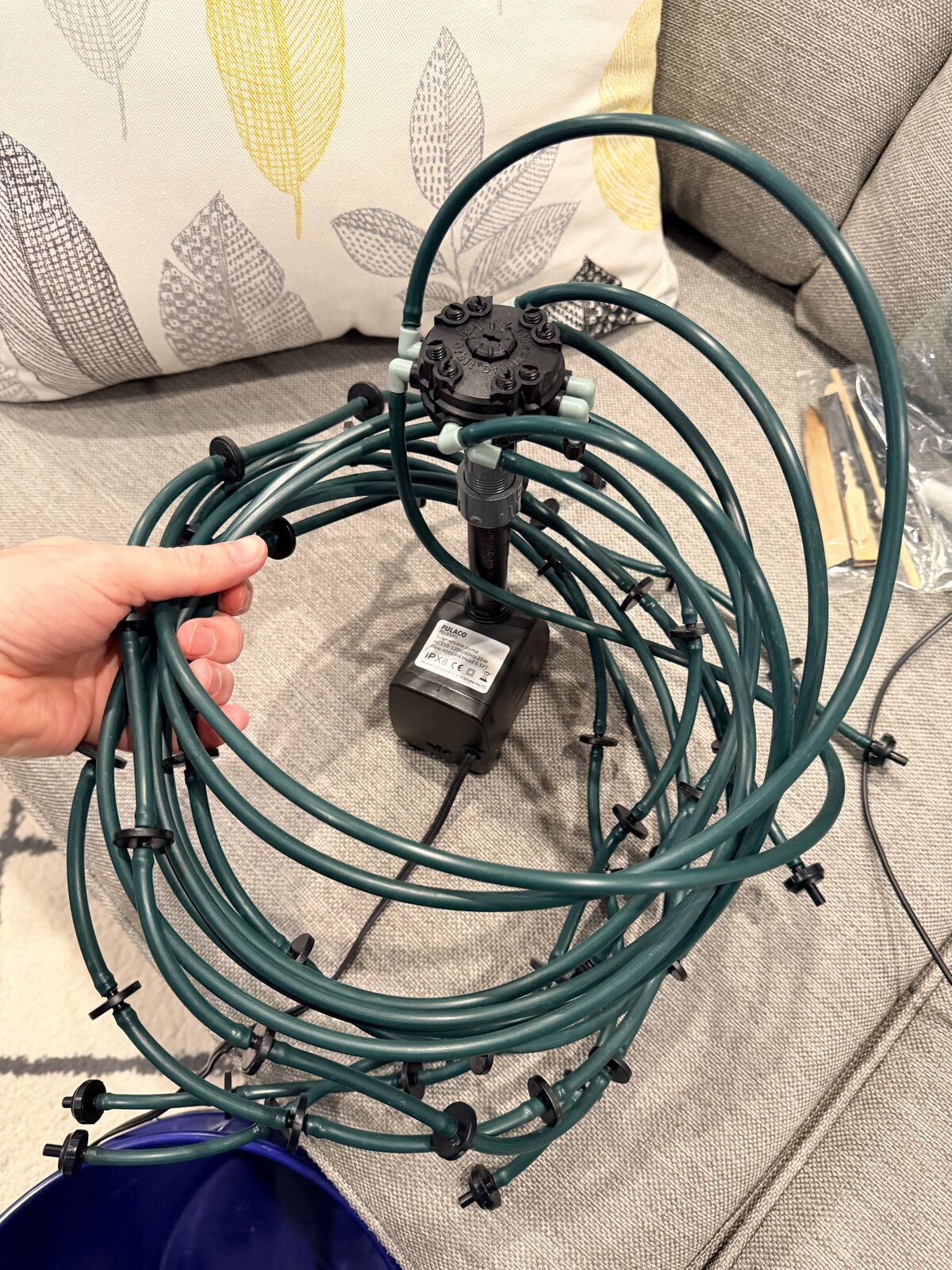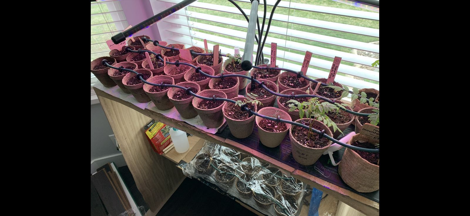 VenmoI made this watering system to water indoor seedling and sapling trees and plants while I would be away on vacation. It includes warming pads to keep the plants warm, a UV light to give new plants the light they need to start growing, and a watering system made from a pump in a 5 gallon bucket and multiple drip lines to water all the plants. I plugged it into a wifi outlet (not included) so I could turn the pump on and off while away to water the plants when needed. It works great.