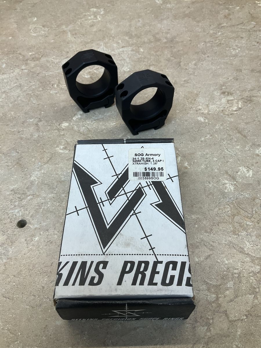 34mm x 1.26" (xtrahigh) rise. For picatinny rail mount. Superior quality rings made in the USA. 4 screw caps. Removed from packaging to check scope position but had to go with different height. New condition. Sitting on the loading shelf too long. My loss, your gain.