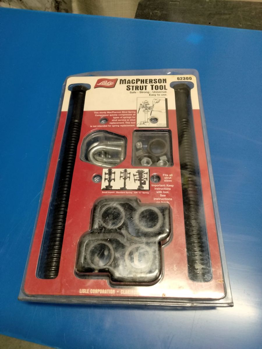 For MacPherson Strut Springs only. This is super safe strut spring compressor. Fits many strut spring sizes, import and domestic. Heavy duty clamps and bolts securely hold spring during operation. Brand new. Made in USA by "Lisle". Cash only. Text please.