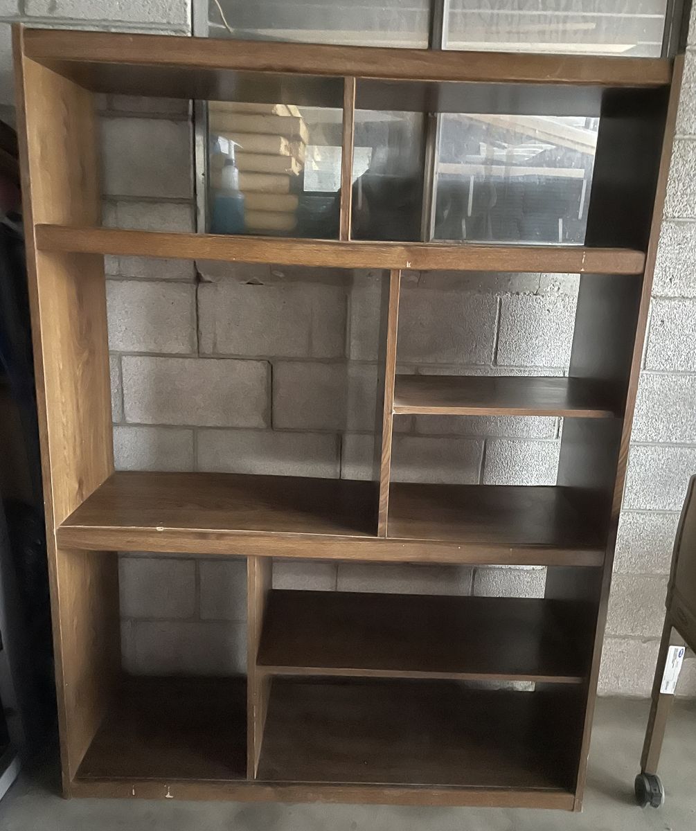 VenmoWood-grain finish bookcase features a staggered, open-shelf design with various compartment sizes for displaying books or decor. This shelf is located in Murray , I’m posting for my mother- in -law.