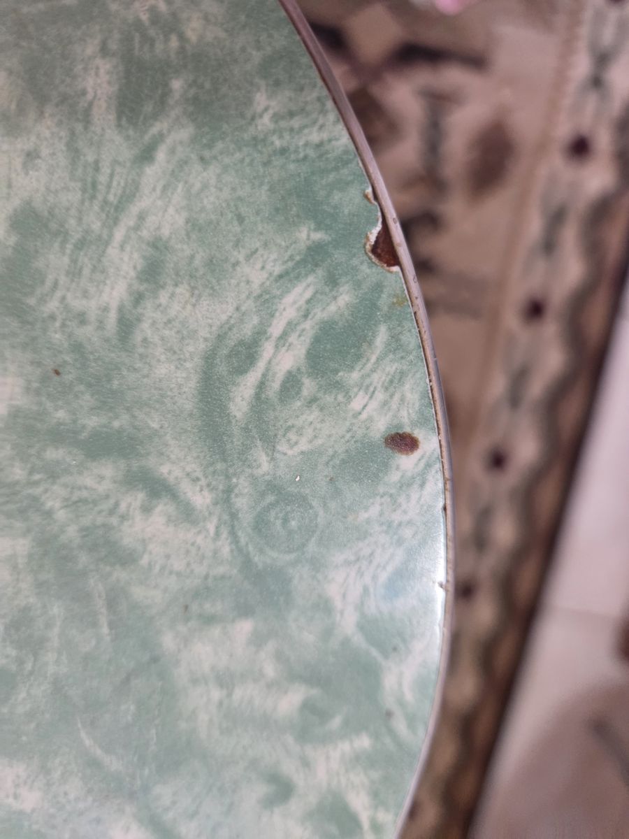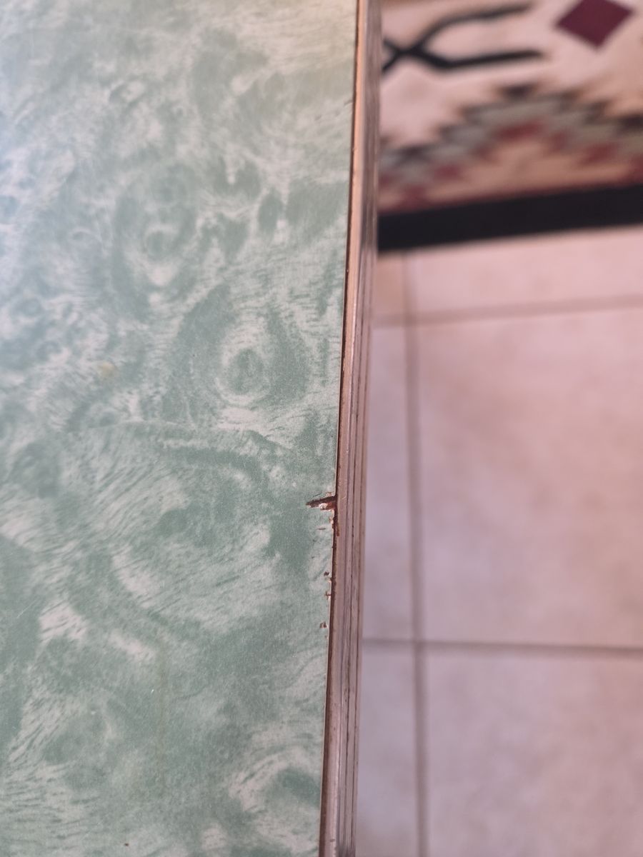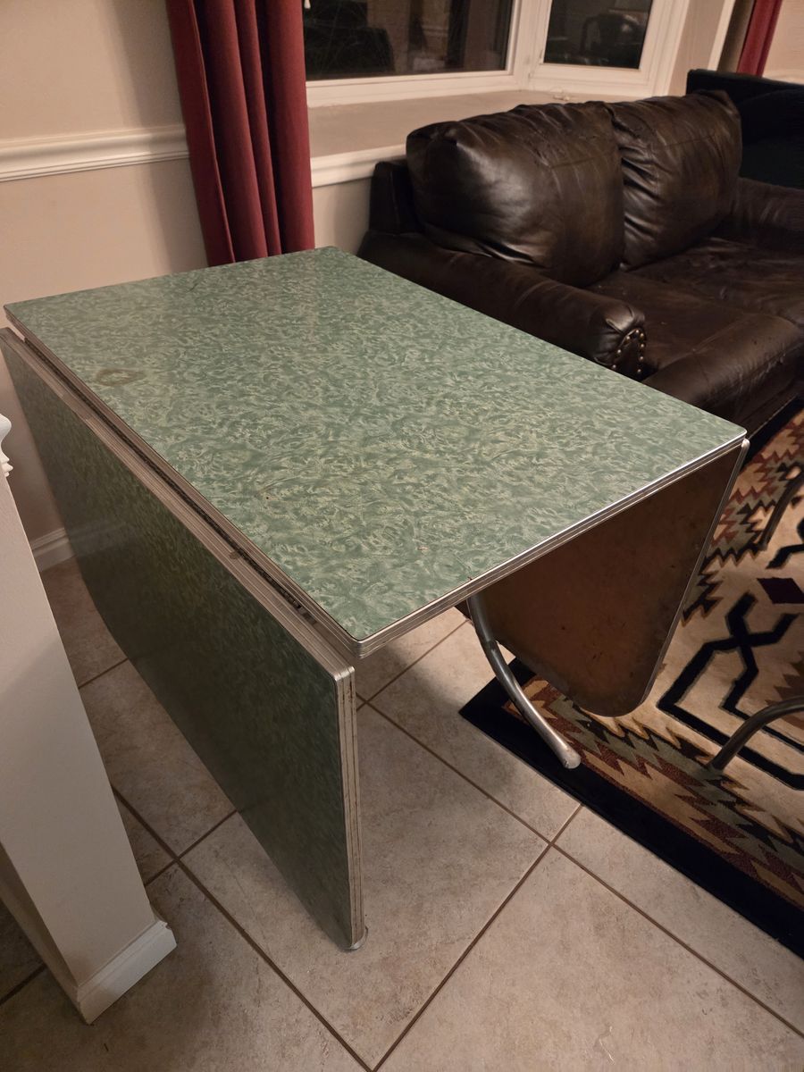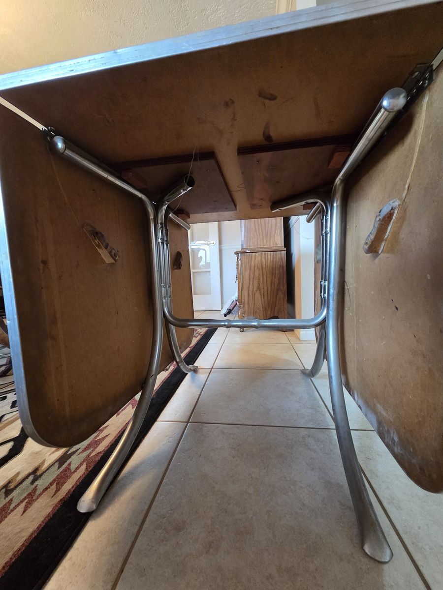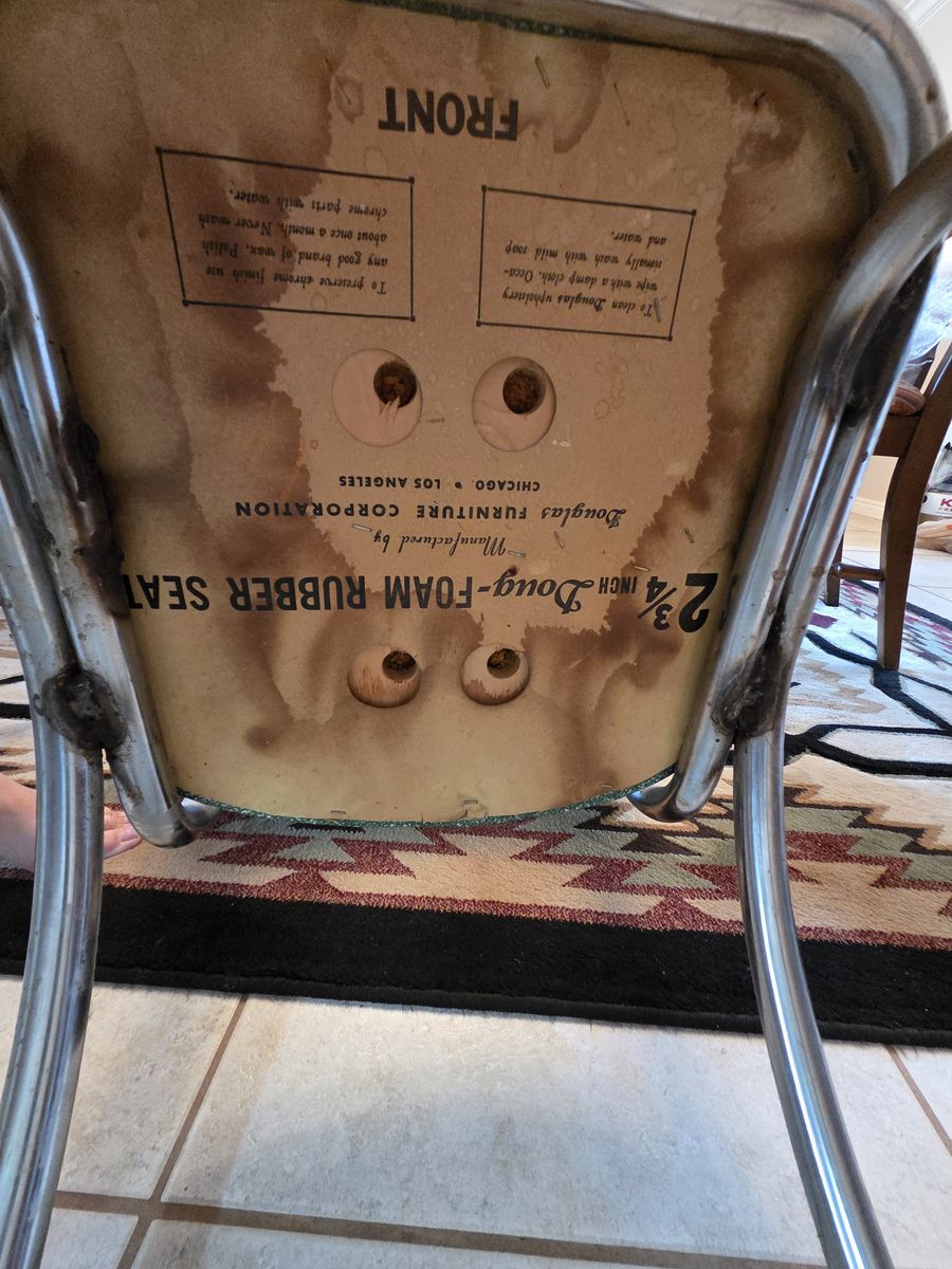 Venmo1950's formica chrome set. Manufactured by Douglas Furniture Co. Los Angeles Chicago. This is my dream set but my husband disagrees. It needs cleaning and a little work but it is in fantastic condition. Seats have some cracking to vinyl as noted. Also missing some decorative studs. The seat backs are all good. Table has a couple tiny nicks as noted. Use it as is or refinish. Please come give this dream a good home! Located in Mountain Green.