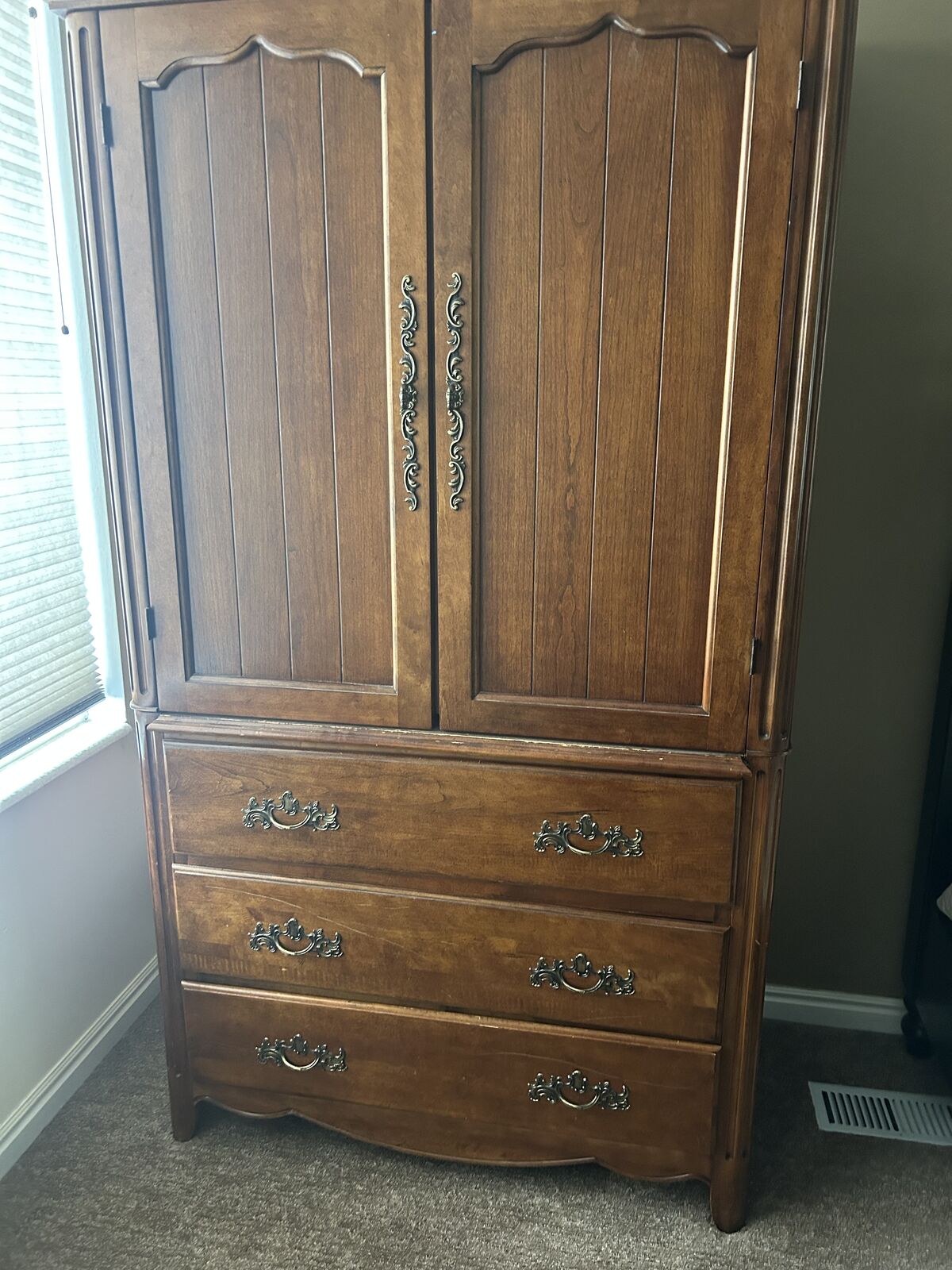 ApplePayOld wooden armoire with three drawers. Over 6 ft high, 20 inches deep, and 40 inches wide. the doors sometimes come open, but that could be fixed. I just don't need the armoire. Please note this piece of furniture is very heavy. It will require multiple people to move, plus a large vehicle (truck) to transport it. 50.00 or best offer