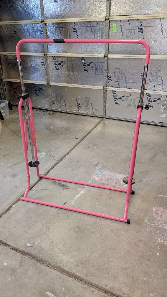 Venmogymnastics bar, multiple adjustable heights, condenses for easy storage.