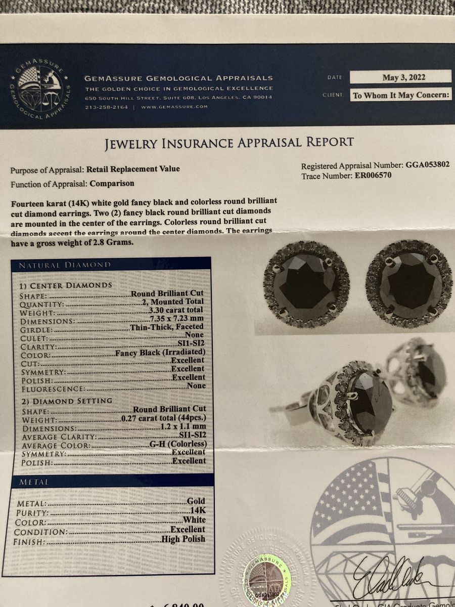 VenmoFourteen karat (14K) white gold fancy black and colorless round brilliant cut diamond earrings. Two (2) fancy black round brilliant cut diamonds are mounted in the center of the earrings. Colorless round brilliant cut diamonds accent the earrings around the center diamonds. The earrings have a gross weight of 2.8 Grams.