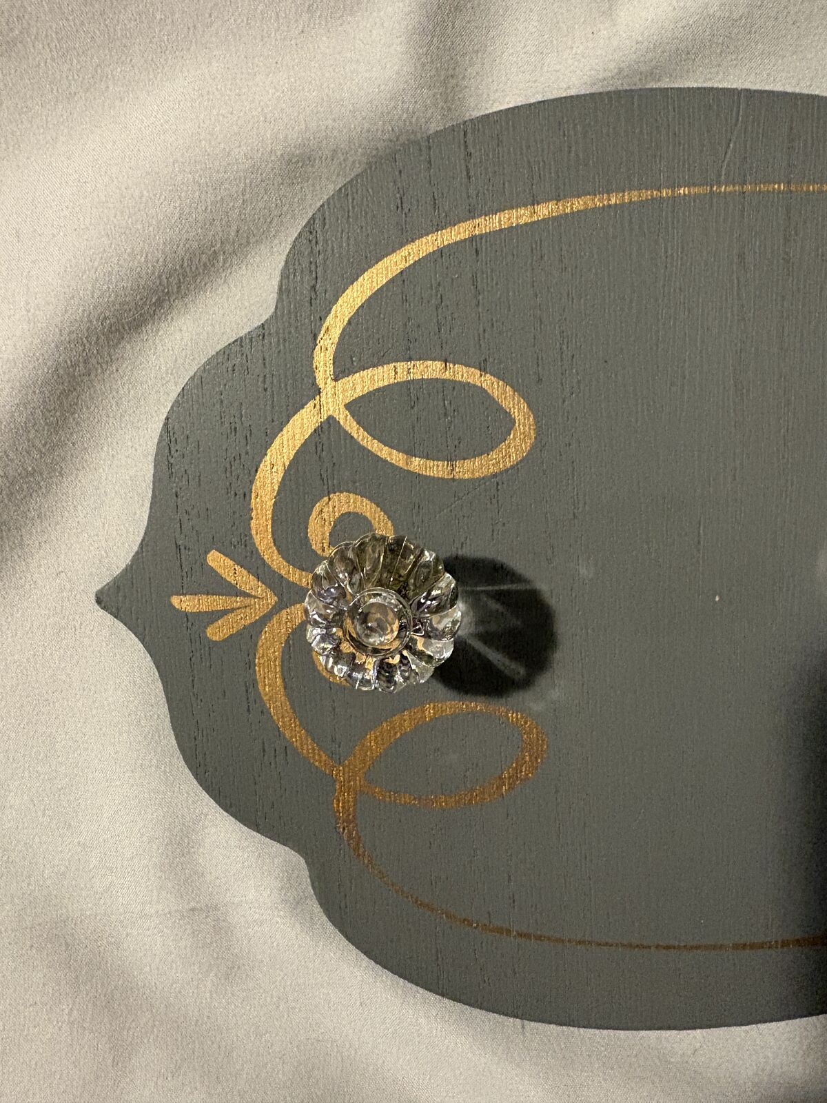 Cute grey with a gold design. 5 knobs for hanging things. Approximately 18” long and 6-8” wide at the thickest point.