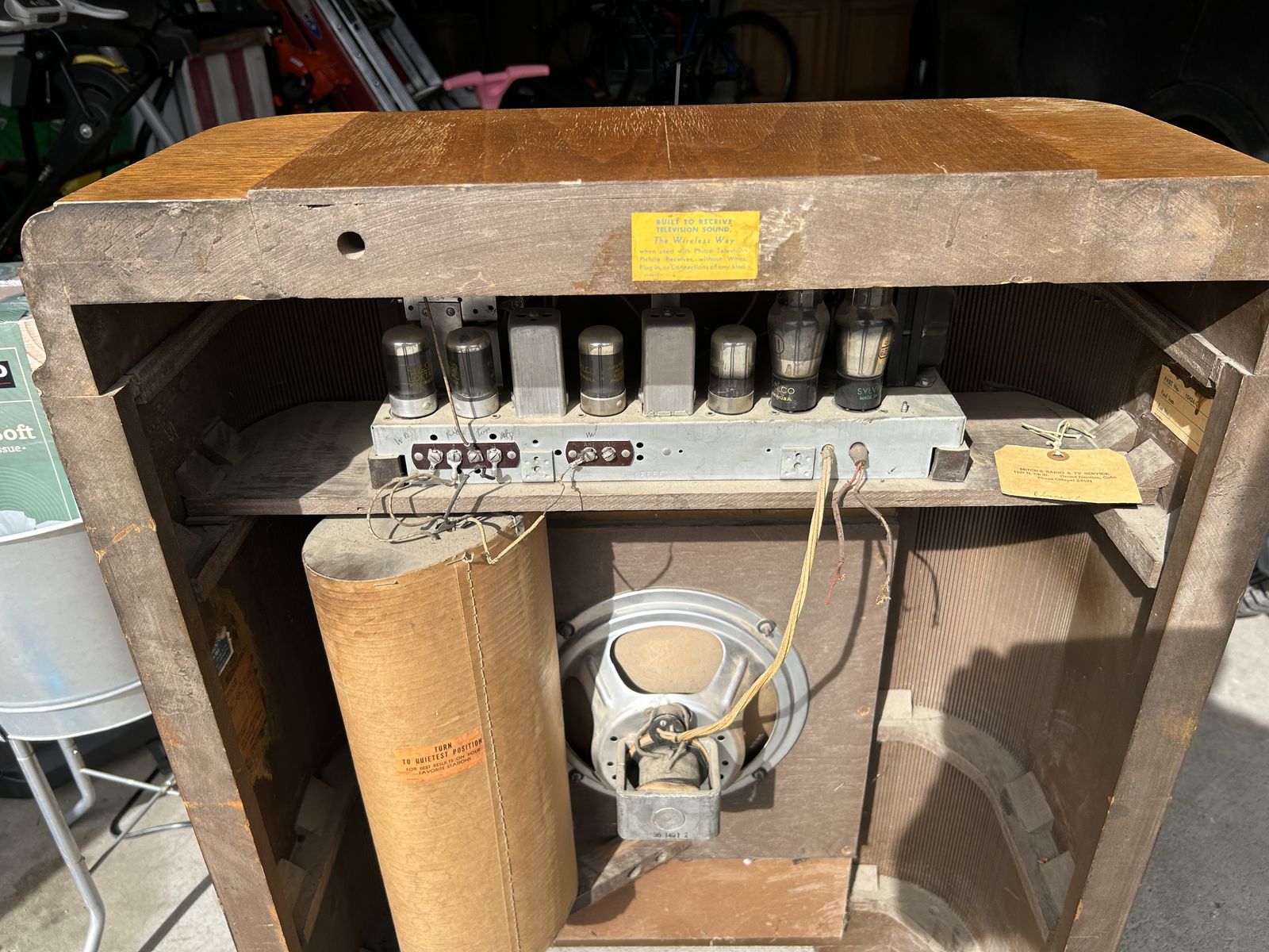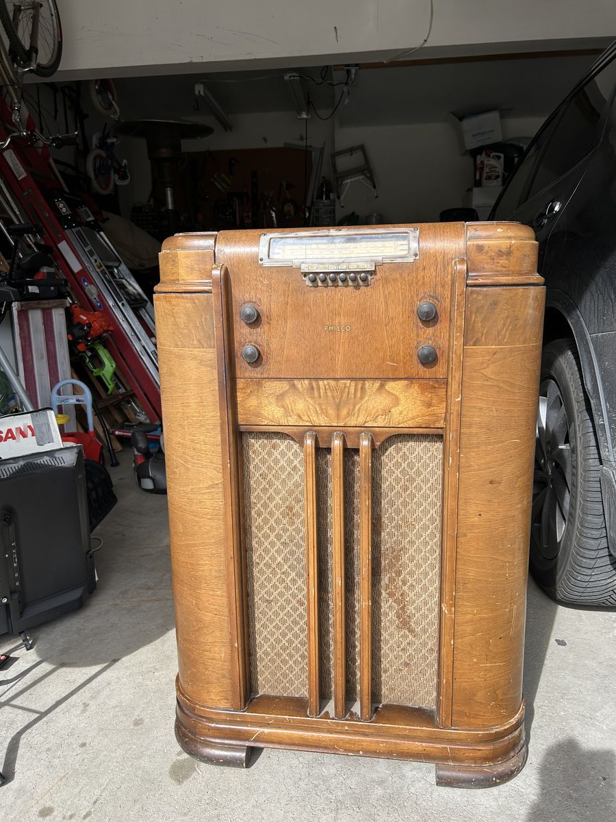 VenmoPhilco console AM, shortwave, TV audio receiver. Cabinet is 38” x 26” x12”. Tuner appears to be intact, but is missing the power cord. Condition is solid with some scratches and gouges.