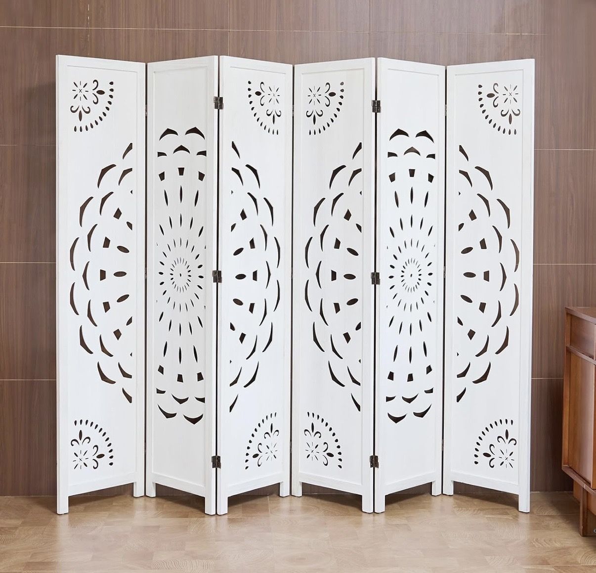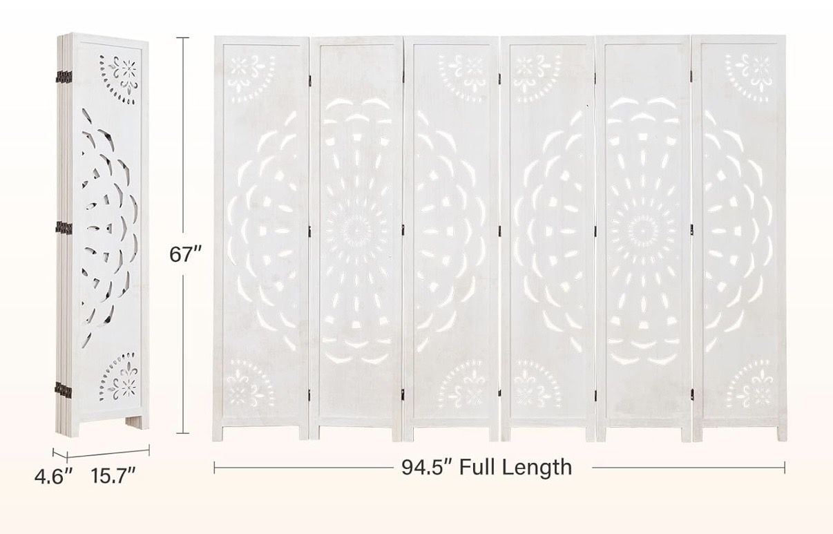 ApplePayThis a new in the box room divider. It has 6 panels so it can be adjusted accordian style to whatever you want it to be. laid flat measurement is 94.5" W x 67" H. We bought this for our daughter who had a work from home job and lived in an apartment but it wouldn't fit in her space.