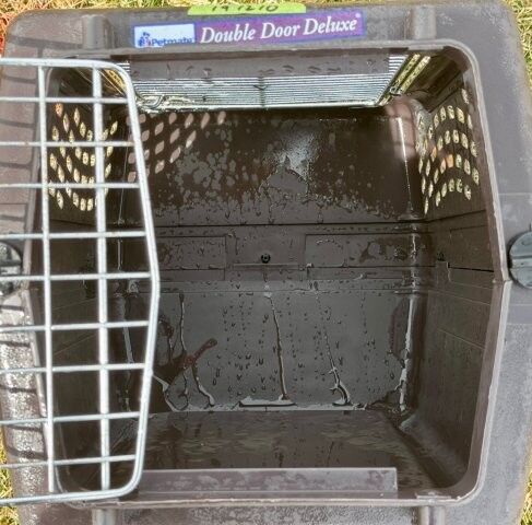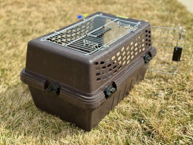 Double door pet kennel carrier. Fits pets 7" to 9" tall, Up to 10 lbs. Chihuahuas, Small Animals and Kittens. 19"L x 13"W x 10"H. Good condition