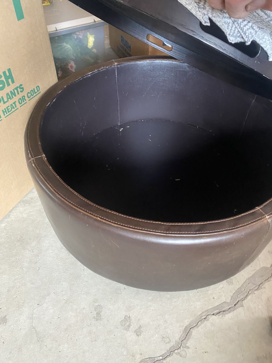 Ottoman with fabric top and leather bottom. Opens up for storage