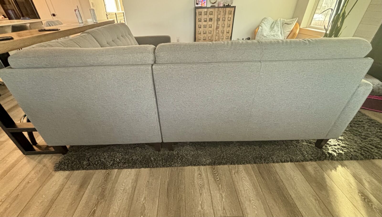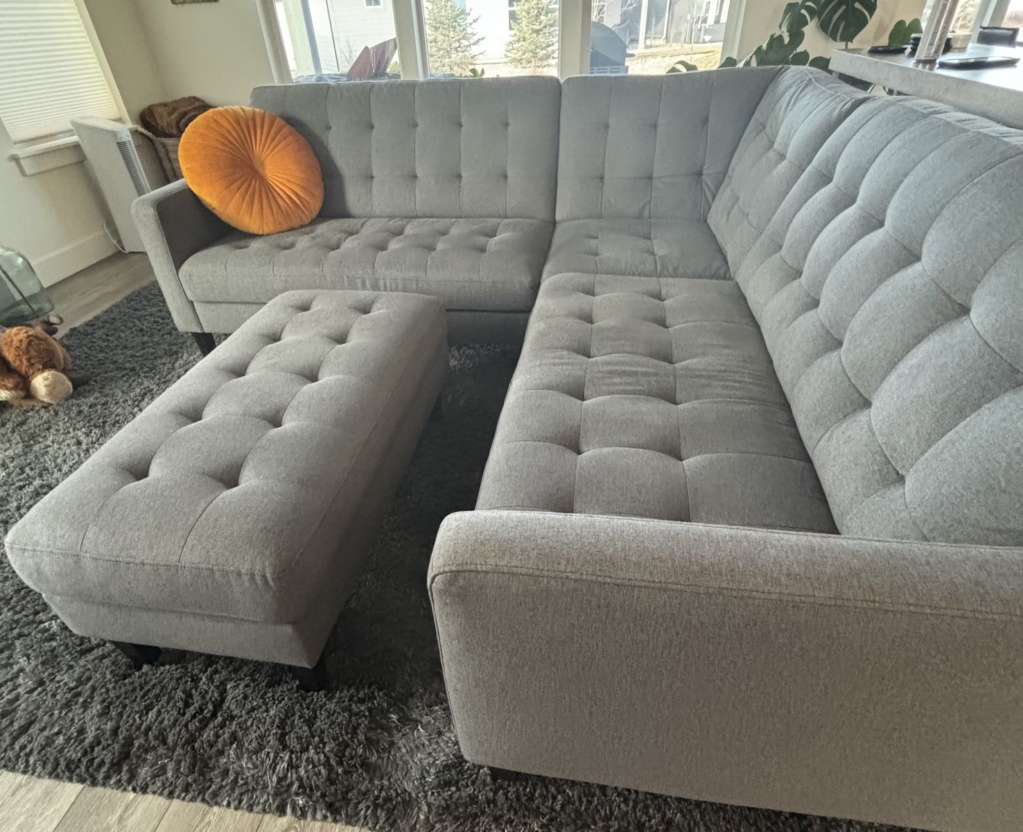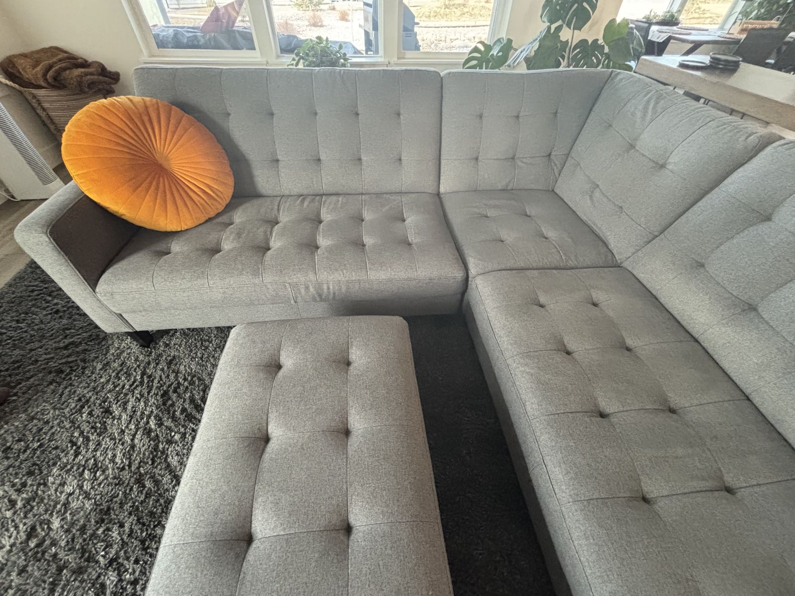 This is a lovely mid century modern sectional sofa for sale. It was purchased from Scandinavian Designs and has been well-maintained in a smoke-free home. The sectional sofa is in excellent condition, with no rips or damage. It's perfect for smaller spaces and comes with a matching ottoman. Dimensions are as follows: - Sectional: 7'6 L x 7'6 W x 3' H - Ottoman: 43 x 21. If you're looking for a stylish and compact seating solution, this mid century modern sectional sofa is a great option.
