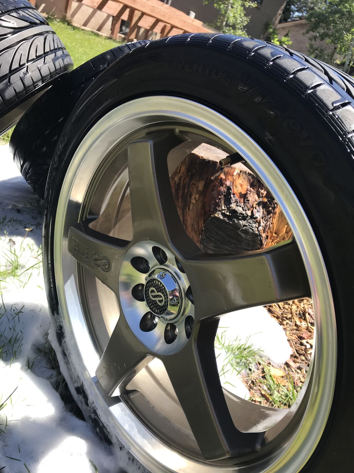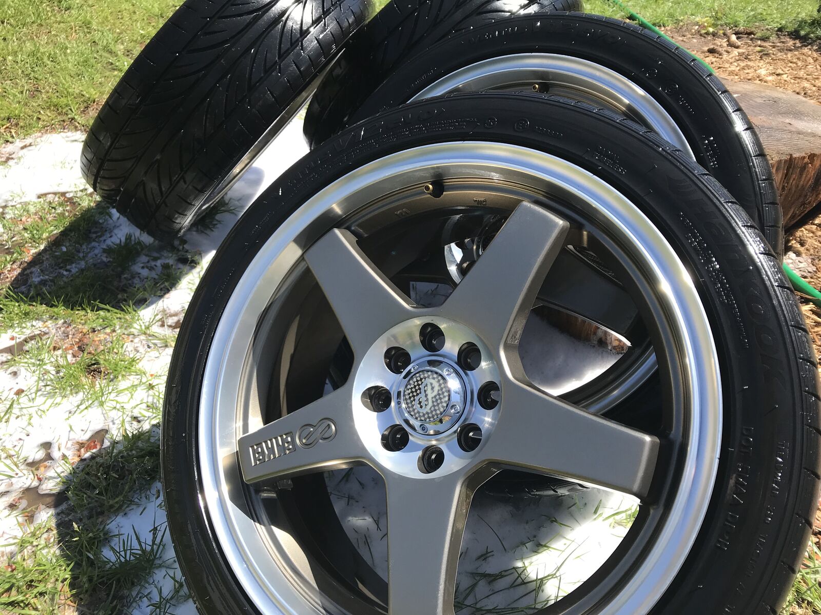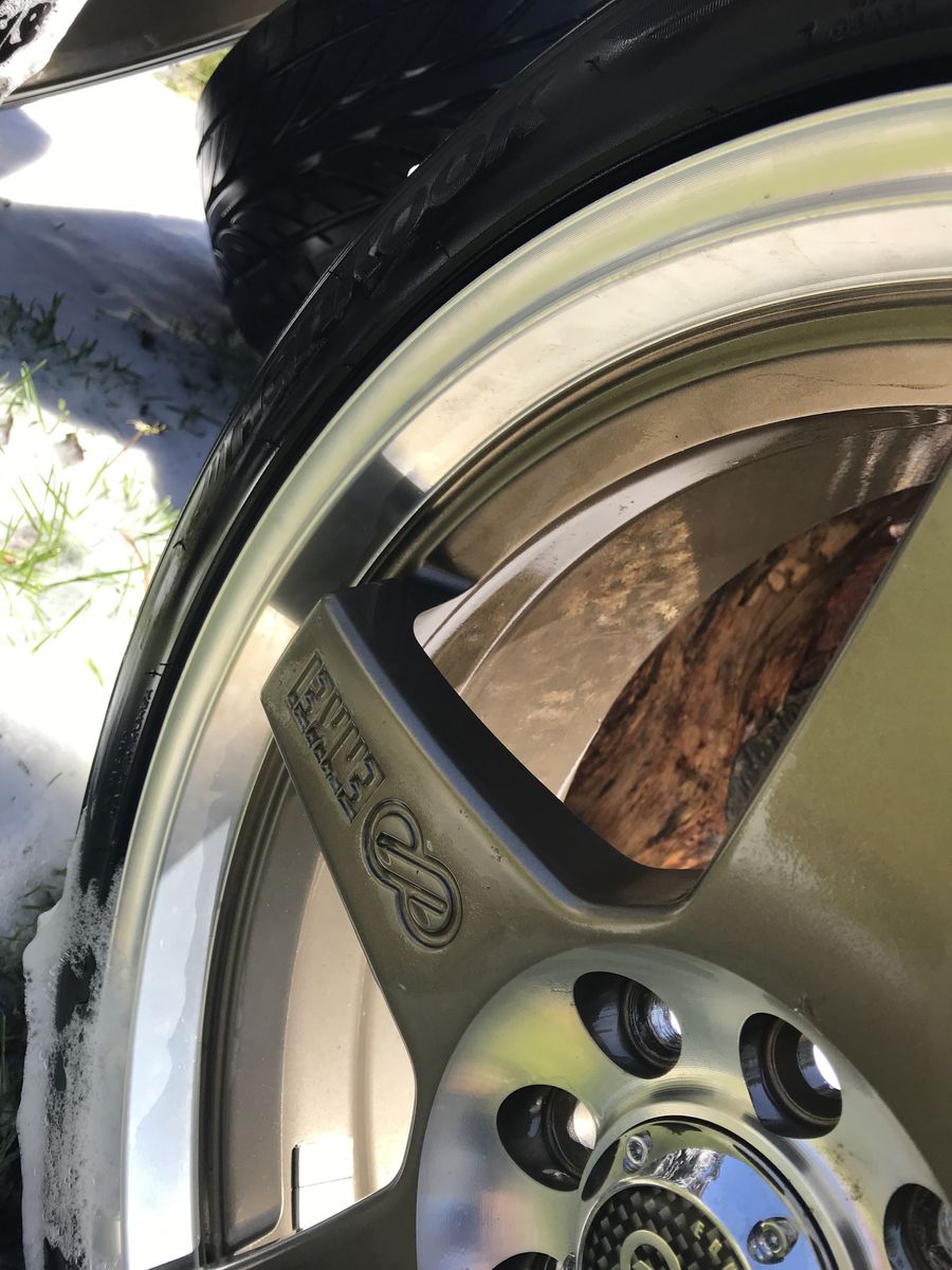 VenmoHave a set of Enkei EV5 in bronze with polished lips, They are 17x7 with both 4x100 and 4x108 bolt patterns. they have Hankook Ventus v12 evo low profile tires on them 205/45s, the tread is still really good but the tires are pretty old and hard so may want to replace them, the wheels have been sitting in my garage for awhile but they are still in really good shape, I had them on a 03 ford focus ZX3 for a short period of time before selling the car, took these off before I sold it and have just been sitting on them one wheel has some cosmetic damage on the inside of the barrel that cannot be seen from the outside, some debris from the road had got caught inside of the wheel and put some good scraps into it, but the wheel is fine and hold air perfectly, they all do, the other 3 are almost flawless, asking 500 as far as I know you can’t get these wheels in this bolt pattern anymore (the 4x108)
