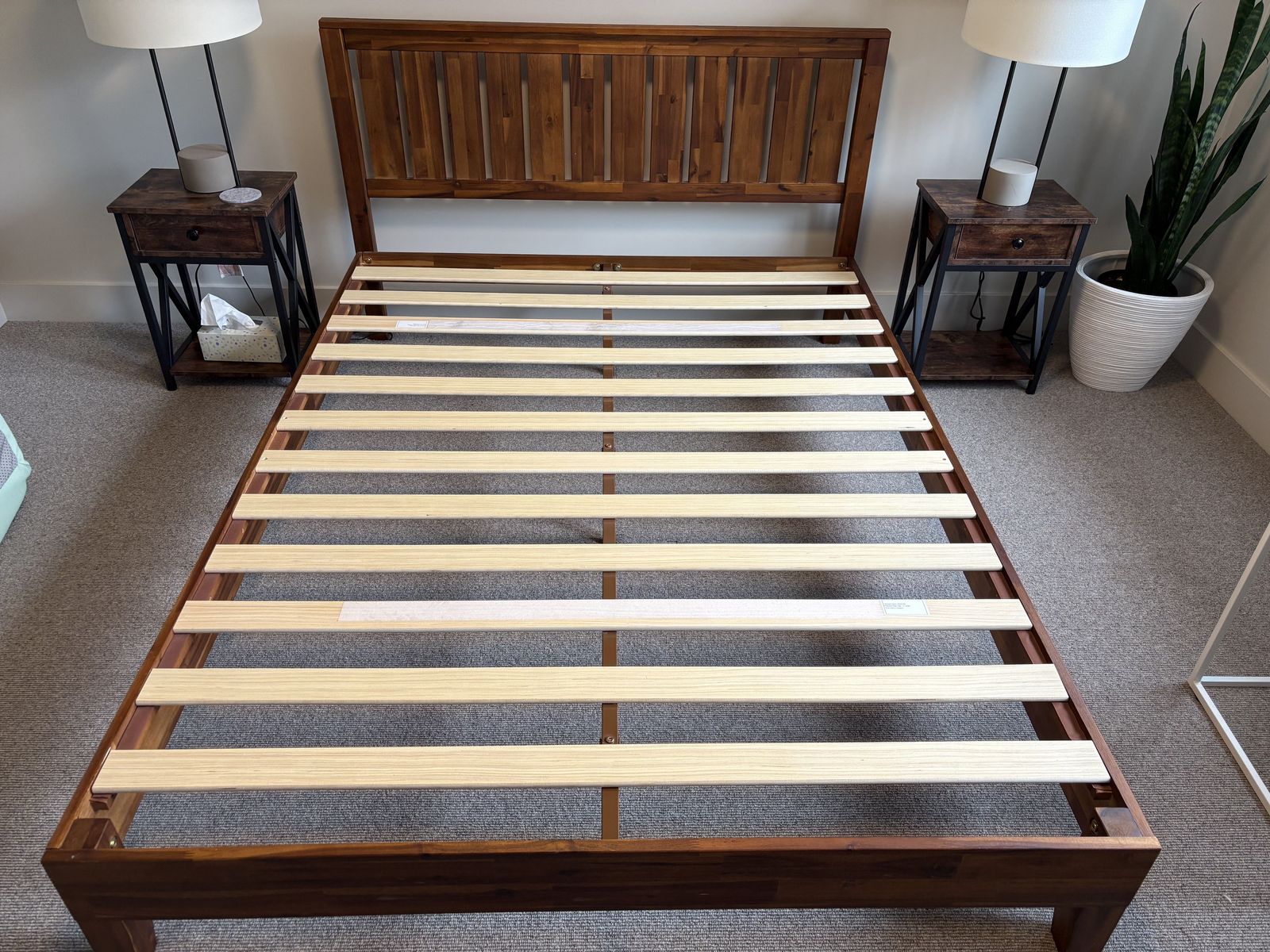 The bed frame and nightstands have a warm, natural wood aesthetic that pairs well with modern farmhouse, rustic, or transitional décor. The nightstands feature a stylish X-frame design that photographs beautifully and holds up well in everyday use.